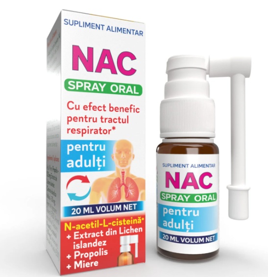 NAC Spray Adulți, 20 ml, Justin Pharma Descriere generală NAC Spray Adulți oferă protecție respiratorie, susținerea imunității și confort în fiecare pulverizare. Formula sa avansată combină extractul de propolis, lichen islandez și N-acetil-cisteină (NAC), alături de ingrediente naturale care calmează gâtul iritat și ajută organismul să facă față sezonului rece sau perioadelor solicitante. Produsul nu conține alcool și are un gust plăcut de căpșune, îndulcit natural cu miere. Beneficiile produsului Protecție și confort pentru gât – Extractul de lichen islandez ( Cetraria islandica thallus ) formează un strat protector pe mucoasa gâtului, contribuind la calmarea iritațiilor și a senzației de disconfort. Susținerea sănătății respiratorii – N-acetil-cisteina (NAC) ajută la fluidizarea secrețiilor bronșice, facilitând respirația și menținerea sănătății căilor respiratorii. Imunitate naturală – Propolisul, recunoscut pentru proprietățile sale antimicrobiene și antioxidante, susține apărarea naturală a organismului împotriva factorilor externi. Efect antioxidant puternic – NAC și propolisul contribuie la protecția celulelor împotriva stresului oxidativ, sprijinind sănătatea generală. Administrare ușoară și gust plăcut – Formula cu aromă naturală de căpșune și miere face produsul ușor de utilizat și agreabil la gust. De ce să alegi NAC Spray Adulți Formulă avansată pentru respirație ușoară și imunitate puternică. Administrare practică, sub formă de spray oral, pentru efect rapid și eficient. Ingrediente naturale cu eficiență dovedită: propolis, lichen islandez și N-acetil-cisteină. Gust plăcut, potrivit pentru utilizare zilnică. Ingrediente active Propolis pulbere Extract de Lichen islandez ( Cetraria islandica thallus ) N-Acetil-Cisteină (NAC) Mod de administrare Adulți: 3 pulverizări, de 3 ori pe zi, direct în cavitatea bucală sau conform recomandării specialistului. Pentru eficiență maximă, se recomandă evitarea consumului de alimente sau lichide timp de 30 de minute după utilizare. Atenționări A nu se depăși doza zilnică recomandată. A nu se lăsa la îndemâna și vederea copiilor mici. Suplimentele alimentare nu înlocuiesc o dietă variată și un stil de viață sănătos. Nu este recomandat femeilor însărcinate sau care alăptează, persoanelor alergice la produsele stupului sau la oricare dintre ingredientele produsului. Administrarea la copii se va face doar la recomandarea medicului. Prezentare Flacon cu pulverizator, conținând 20 ml soluție orală.