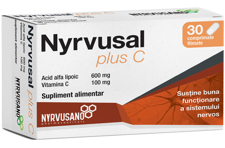 Nyrvusal PlusC este indicat pacientilor cu neuropatii de diferite etiologii in FAZA ACUTA; Mecanism de actiune acid alfa lipoic: Antioxidant puternic ? lipofil si hidrofil Regenereaza alti antioxidanti ? vitamina C si E Stimuleaza productia de glutation si coenzima Q10 Chelator de metale: cupru, mangan, zinc, cadmiu, mercur Administrare: 1 comprimat pe zi sau in functie de recomandarea medicului;