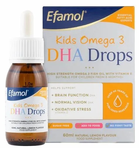 Picaturi cu Omega 3 DHA pentru copii, 60ml, Efamol Picaturile cu Omega 3 DHA pentru copii Efamol contin o concentratie crescuta de acizi grasi Omega-3 obtinuti din ulei de ton, cu un continut ridicat de DHA (acid docosahexaenoic) si EPA (acid eicosapentaenoic), completate cu vitamina E pentru protectie antioxidanta. Formula este special conceputa pentru a sustine dezvoltarea normala a creierului, a vederii si functia normala a inimii la copii. Produsul are gust placut de lamaie, nu are gust de peste si poate fi adaugat cu usurinta in alimente sau bauturi. Nu contine lactoza, zahar, drojdii, co