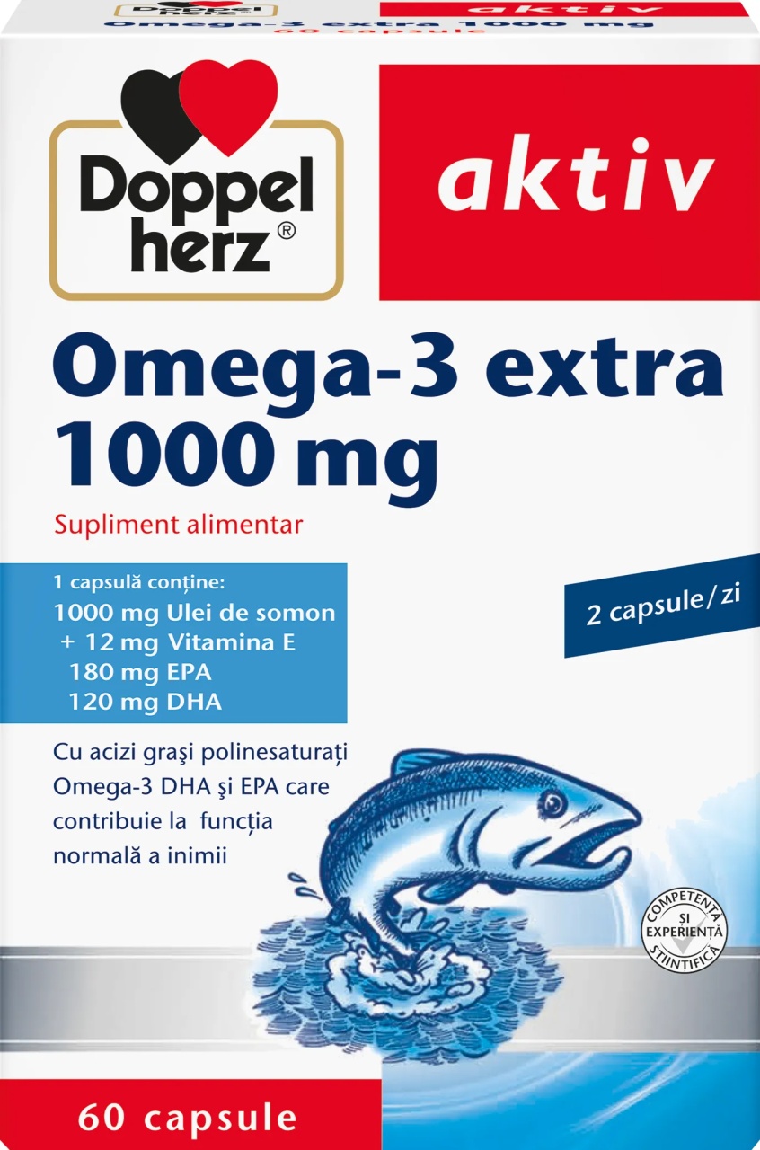 Omega 3 extra 1000 mg, 60 capsule, Doppelherz Omega 3 Extra 1000 mg , Doppelherz, contribuie la funcționarea normală a creierului și inimii. O capsulă de Omega 3 Extra 1000 mg, Doppelherz, furnizează 180 mg EPA și 120 mg DHA, acizi grași Omega-3 care contribuie la funcția normală a inimii. În plus, fiecare capsulăOmega 3 Extra 1000 mg, Doppelherz, conține 12 mg de Vitamina E, care contribuie la protejarea celulelor împotriva stresului oxidativ. Beneficii Omega 3 Extra 1000 mg, Doppelherz DHA și EPA contribuie la functia normală a inimii Ulei de pește de înaltă calitate și puritate Conține 1000 mg ulei de pește în fiecare capsulă Vitamina E protejează celulele împotriva radicalilor liberi FARA GLUTEN FARA LACTOZA Acizii Omega-3 sunt materii grase benefice, care au un rol esenţial în funcţionarea la parametri optimi a sistemului cardiovascular şi a creierului. Din păcate însă, organismul uman nu este capabil să-i producă. De aceea, se recomandă introducerea acestora în organism printr-o alimentaţie adecvată sau suplimente nutritive. Principalele beneficii ale Omega 3 Efectul benefic al acizilor grași Omega-3 a fost relevat prin intermediul studiilor efectuate de către cercetatori danezi în Groenlanda. Aceștia au constatat că, deși nu au o alimentație echilibrată, eschimoșii rămân adesea activi până la vârste înaintate, incidența bolilor cardiovasculare în rândul acestei populații fiind extrem de scăzută. Acest lucru se explică prin faptul că peștii de apă rece, care reprezintă una dintre puținele lor surse de hrană, sunt deosebit de bogați în acizi grași Omega-3. Acizii grași polinesaturați Omega-3 EPA (acid eicosapentaenoic) si DHA (acid docosahexaenoic) contribuie la buna funcționare a inimii. Organismul uman nu este capabil să producă acizi grași Omega-3, iar aceștia trebuie introdusi în organism prin alimentație sau suplimente nutritive. Acizii grași Omega 3: Ajută la funcţionarea eficientă a sistemului cardiovascular şi a creierului, inimii şi ochilor Contribuie la reducerea riscului de producere a infarctului miocardic Ameliorează simptomele poliartritei reumatoidale Compozitie Omega 3 Extra 1000 mg per Doză zilnică (= 2 Capsule): Nutrient Cantitate Acizi grasi Omega-3 30 % EPA (Acid eicosapentaenoic) 180 mg DHA (Acid docosahexaenoic) 120 mg Vitamina E 12 mg α-TE Ulei de somon 1000 mg Ingrediente Omega 3 Extra 1000 mg: o capsulă conține: Ulei de somon (69 %), gelatină, glicerol (umectant), apă purificată (solvent), DL-alpha-tocoferol (Vitamina E). Mod de utilizare Omega 3 Extra 1000 mg, Doppelherz: Se administrează 2 capsule/zi, în timpul mesei. Prezentare: 60 capsule