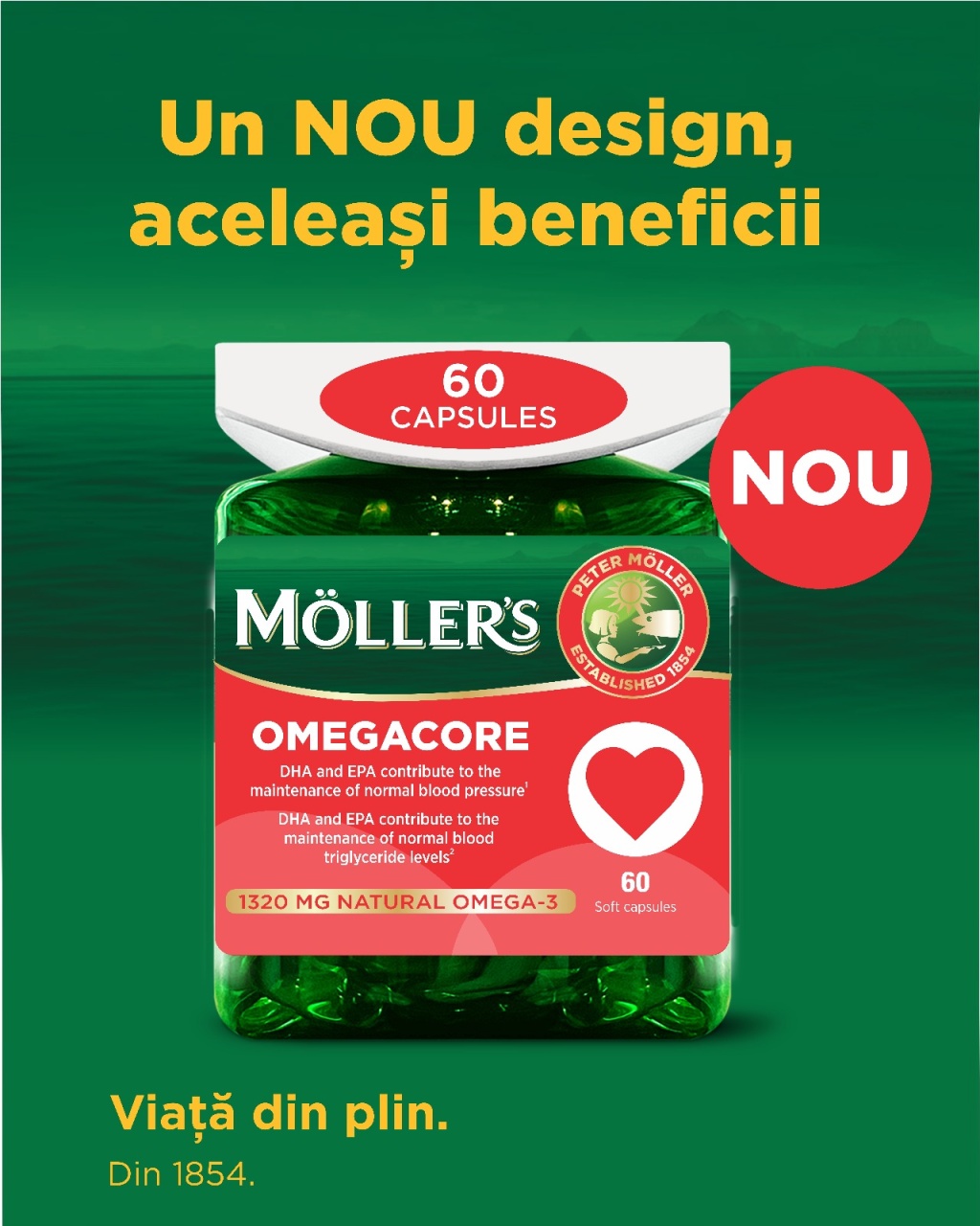 Omegacore, 60 capsule moi, MollerS Omega-3 natural sub forma de trigliceride, din ulei de peste. Proprietati: - ajuta sistemul cardiovascular; - mentine nivelul normal al trigliceridelor; - EPA si DHA contribuie la functionarea normala a inimii.