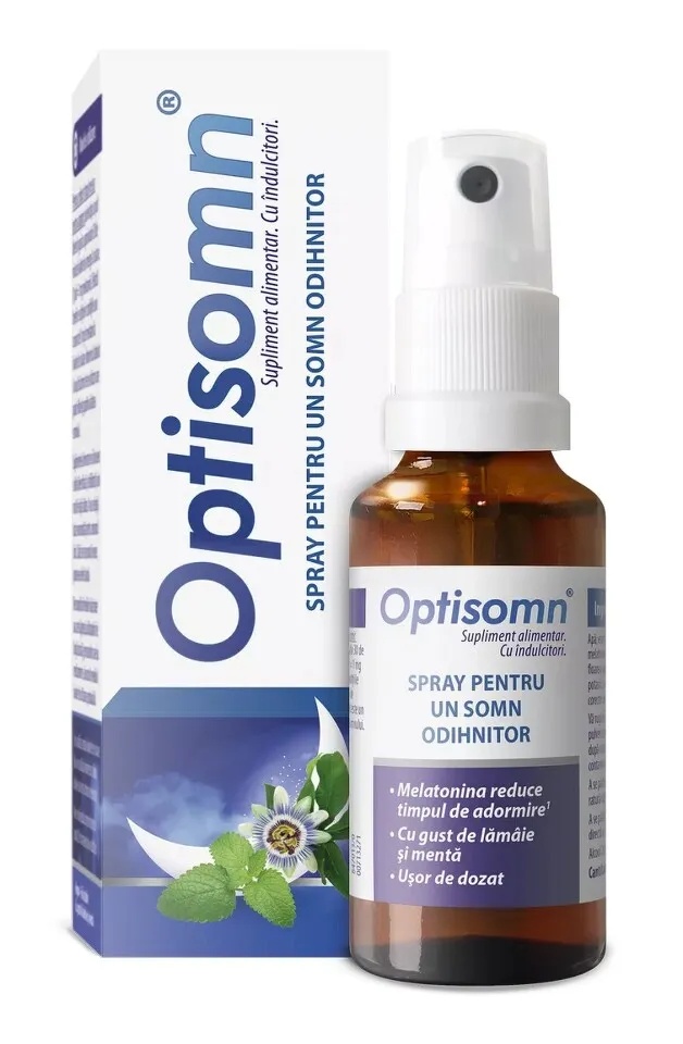 Optisomn Spray, 30 ml, Zdrovit Optisomn este special formulat pentru a oferi un somn odihnitor si dimineti productive, energizate. Un somn odihnitor și suficient este important pentru bunăstarea și performanța umană. Chiar și câteva zile cu probleme de somn pun o presiune asupra corpului și a aptitudinii mentale adesea legat de fazele stresante ale vieții, munca în ture și de noapte sau zborurile lungi cu avionul. Puteți susține un somn sănătos cu o anumită rutină: camere întunecate, temperatura camerei ajustată, fără mese grele înainte de culcare și fără consum de alcool. Optisomn® spray combină melatonina cu extractul de floarea pasiunii și astfel ajută la reducerea timpului necesar pentru a adormi și la obținerea unui somn odihnitor.Prin utilizarea unui complex de ingrediente naturale, acest produs imbunatateste calitatea somnului natural. Mod de utilizare: Pulverizati un puf direct in gura cu aproximativ 30 de minute inainte de a merge la culcare. 1 puf = 1 mg melatonina. Efectul benefic se obtine in conditiile unui consum de 1 mg de melatonina inainte de culcare. Intunericul absolut la locul de dormit este un factor care poate influenta pozitiv calitatea somnului. Va rugam sa pastrati varful pulverizatorului acoperit cu capacul dupa utilizare, pentru a preveni contaminarea si uscarea acestuia. Prezentare: 30 ml