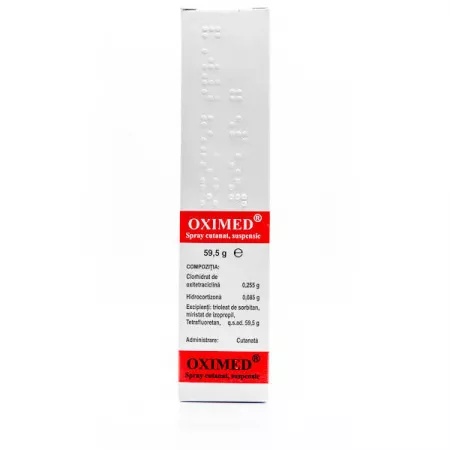 Oximed spray cutanat este indicat pentru: – Dermatoze: eczeme exudative suprainfectate inclusiv eczema atopica, dermatita eczematiforma, dermatita alergica si seboreica, neurodermite diseminate sau circumscrise, prurit cu lichenificare, eczeme. – Dermatite de contact suprainfectate. – Ulcere crurale. – Arsuri chimice sau termice – Leziuni de decubit. Contraindicatii: Hipersensibilitate la oricare dintre componentele produsului. Precautii: Înainte să utilizați Oximed spray cutanat, adresaţi-vă medicului dumneavoastră sau farmacistului. Sarcină, alăptarea şi fertilitatea: Oximed este contraindicat in timpul sarcinii si alaptarii (datorita riscului teoretic de afectare a dentitiei permanente datorita prezentei oxitetraciclinei). Conducerea vehiculelor şi folosirea utilajelor: Oximed nu influenteaza capacitatea de a conduce vehicule sau de a folosi utilaje. Mod de administrare: Oximed se pulverizeaza (dupa agitarea flaconului) timp de 2-3 secunde la nivelul zonei de tratat, de la o distanta de 15 cm. Oximed se aplica dupa curatirea prealabila a pielii, atunci cand este posibil. Administrarea se repeta de 2-4 ori pe zi. Oximed este utilizat numai pentru administrare topica. Dacă aveţi orice întrebări suplimentare cu privire la acestmedicament, adresaţi-vă medicului dumneavoastră sau farmacistului. Compozitie: Un flacon cu spray cutanat, suspensie conţine clorhidrat de oxitetraciclină 0,255 g, hidrocortizonă 0,085 g și excipienţi: trioleat de sorbitan, miristat de izopropil, norfluran. Grupa farmacoterapeutica: produse dermatologice; corticosteroizi cu potenta slaba in combinatii cu antibiotice. Prezentare: 59,5g Atentionare: Citiţi cu atenţie şi în întregime prospectul înainte de a începe să utilizaţi acest medicament deoarece conţine informaţii importante pentru dumneavoastră. Prospect: www.anm.ro/_/_PRO/pro_5285_14.04.05.pdf