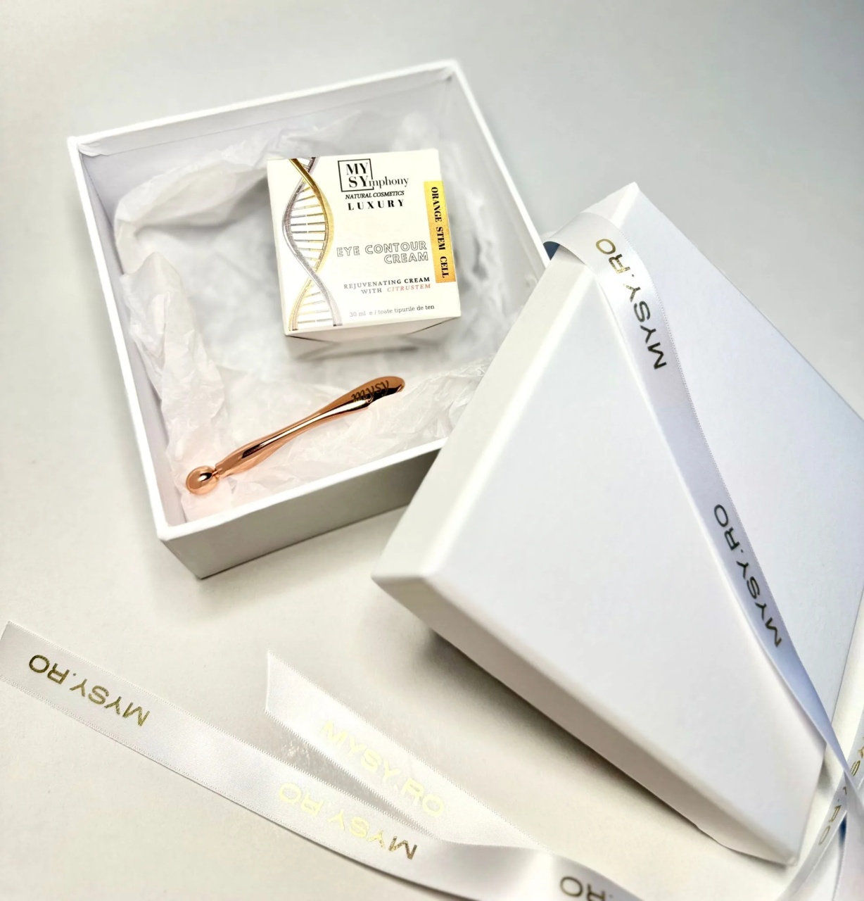 Pachet cadou Beautiful Eyes, My Symphony EYE CONTUR CREAM ( crema pentru contur ochi cu celule stem din portocale) + spatula oțel inoxidabil reutilizabilă personalizata. Nu lasă pelicula grasă pe piele, ilumineaza tenul, hidratează 24 h, are efect de lifting diminuând ridurile fine. Crema rejuvenanta (contur ochi) cu celule stem din portocale (Citrustem) este o cremă ce are în formula ei peste cinci ingrediente active foarte puternice împotriva ridurilor fine, a cearcănelor, și a oboselii. Este ideala si ca baza de machiaj. Această combinație unică face ca pielea ta să fie vizibil mai hidratată și fermă încă după prima utilizare. Conform studiilor clinice efectuate, ingredientul activ principal Citrustem, contribuie la redobândirea proprietăților de elasticitate ale pielii, întinerind-o cu până la 12 ani. Beneficii: diminueaza ridurile fine, hidrateaza pielea subtire si sensibila din jurul ochilor, reda luminozitate pielii, reduce aspectul obosit al tenului. Ingrediente cheie: celule stem din portocale (Citrustem), acid hialuronic, colagen vegetal, vitamina E, ulei de samburi de struguri. COLAGENUL VEGETAL Acesta prezintă beneficii similare cu cele ale colagenului prezent în mod natural în piele,fiind conceput să sporească rezistența structurii cutanate. Este un agent filmogen deoarece îmbracă cu un strat fin, flexibil și neocluziv pielea. Conferă suplețe, elasticitate și confort pielii. Mod de utilizare: se aplica in jurul ochilor ,dimineața după demachierea și tonifierea tenului. Se masează zona cu mișcări circulare pana când produsul se absoarbe in totalitate. Se recomanda pentru tenul mixt / matur . Ingrediente (INCI): Aqua, Simmondsia Chinensis Seed Oil, Vitis Vinifera Seed Oil, CocoCaprylate/Caprate, Citrus Aurantium Dulcis Callus Culture Extract, Glycerin, Aloe Barbadensis Leaf Juice, Glycoproteins, Salix Nigra Bark Extract, Ammonium Acryloyldimethyltaurate/Vp Copolymer, Olive Squalane, Benzyl Alcohol, Chlorphenesin, Tocopherol, Parfum, Sodium Hyaluronate, Citrus Aurantium Dulcis Oil, Cymbopogon Flexuosus Oil, Xanthan Gum, Sodium Benzoate, Potassium Sorbate, Citric Acid, Limonene, Citral, Geraniol, Linalool. Condiții de depozitare: A se păstra în loc uscat și răcoros, ferit de acțiunea directă a razelor solare și de îngheț, la temperaturi cuprinse între 5°C și 25°C. Precauții: Contraindicat persoanelor cu hipersensibilitate la una din componentele produsului. Termen de valabilitate: A se consuma, de preferință, înainte de data inscripționată pe ambalaj. Prezentare: crema pentru contur ochi, 30g + spatula oțel inoxidabil reutilizabilă