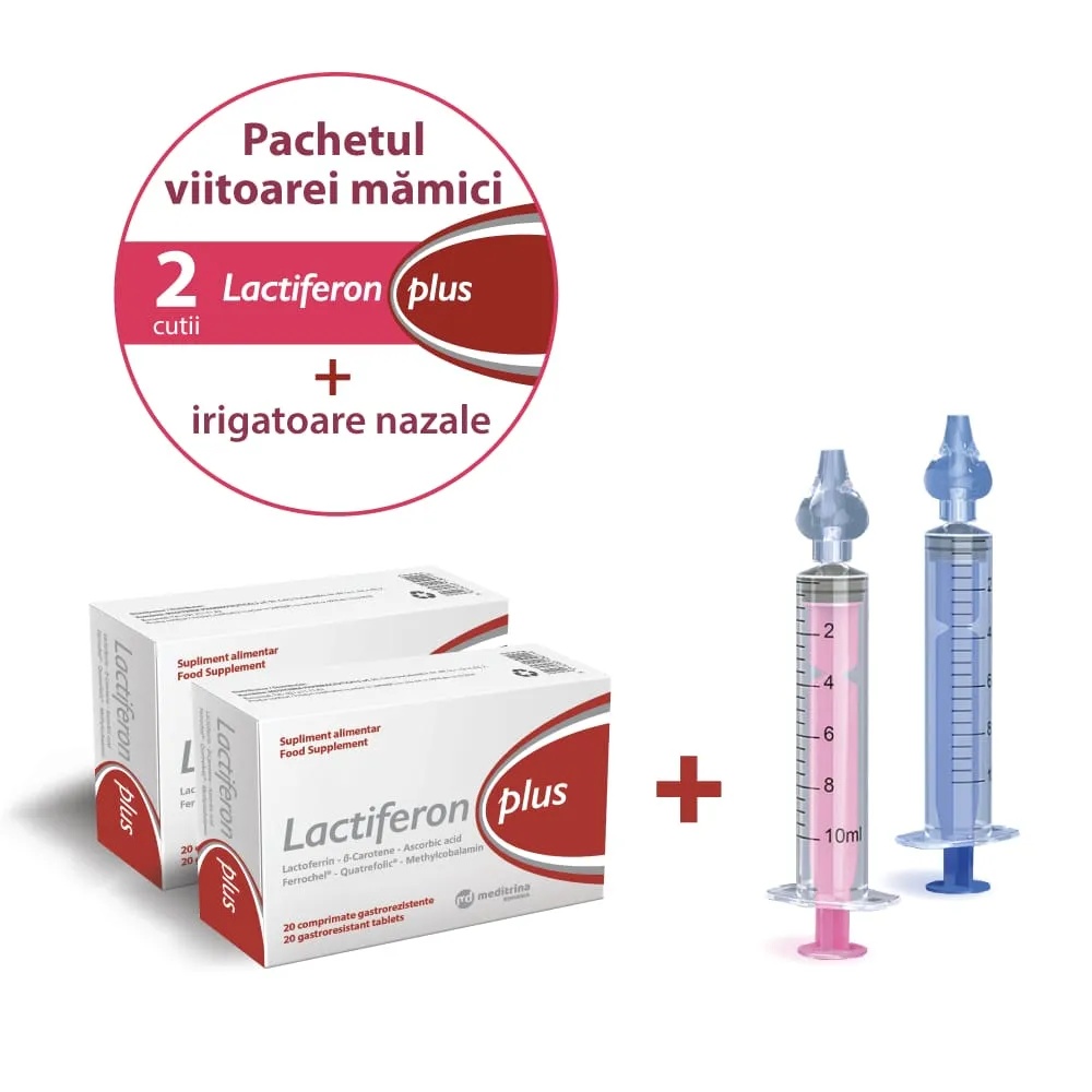 Pachet Lactiferon plus, 20 comprimate, 2 cutii + 2 irigatoare nazale de copii, Meditrina Este o formula complexa ce contine fier bisglicinat (Ferrochel) in asociere cu Lactoferrina si un complex specific pentru absorbtia fierului (Quatrefolic, Acid ascorbic, Beta-Caroten si Metilcobalamina); Poate determina efect instalat rapid care se poate mentine pe o perioada lunga de timp; Poate avea un rol benefic in managementul anemiei feriprive (deficit de fier), dar la recomandarea medicului specialist, poate fi utilizat si in alte tipuri de anemii, cum ar fi: anemia megaloblastica (deficit de acid folic), anemia pernicioasa (deficit de vitamina B12), dar si talasemia minora cu componenta feripriva (boala genetica caracterizata prin nivel scazut al fierului in organism). Mod de administrare: 1-2 comprimate gastrorezistente pe zi la 15 minute dupa masa principala sau mesele principale ale zilei. Ingrediente active: Fiecare comprimat contine Fier bisglicinat (Ferrochel®) 125 mg, Lactoferrina 100 mg, Quatrefolic® (L-metiltetrahidrofolat) 624 µg, Acid ascorbic (vitamina C) 160 mg, Beta-caroten 2,6 mg si metilcobalamina (vitamina B12) 9µg si excipienti. Precautii: Contine lactoferrina, o proteina izolata din laptele de vaca, a nu se administra in caz de intoleranta la lactoza. Produsul este un supliment alimentar si nu poate inlocui o dieta variata si echilibrata si un mod de viata sanatos. Prezentare: 2 cutii x 20 comprimate gastrorezistente + 2 irigatoare nazale copii