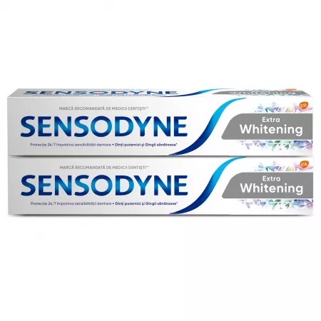 Sensodyne Extra Whitening are actiune superioara de albire*. Formula sa are o tehnologie imbunatatita de albire avand ca beneficii indepartarea petelor fara o actiune mai abraziva asupra dintilor*. Aceasta inseamna ca, prin periaj de doua ori pe zi, Sensodyne Extra Whitening ofera protectie de lunga durata impotriva sensibilitatii dentare si dinti mai albi. * prin periaj dentar de doua ori pe zi Proprietati: – ajuta la indepartarea petelor pentru dinti mai albi; – improspateaza respiratia; – ajuta la mentinerea sanatatii gingiilor*; – ajuta la indepartarea placii bacteriene; – contine fluor pentru a proteja impotriva cariilor dentare; – ofera protectie de lunga durata impotriva sensibilitatii dentare*. Mod de utilizare: Adulti si copii cu varsta de 12 ani si peste: periaza dintii de doua ori pe zi, cel mult de trei ori pe zi, minimizeaza inghitirea, apoi scuipa. Asigura-te ca periezi toate zonele sensibile ale dintilor. Copii cu varsta pana in 12 ani: a nu se folosi de catre copii cu varsta sub 12 ani decat la recomandarea medicului stomatolog sau a medicului de familie. Ingrediente: Aqua, Hydrated Silica, Sorbitol, Glycerin, Pentasodium Triphosphate, Potassium Nitrate, PEG-6, Alumina, Aroma, Titanium Dioxide, Sodium Methyl Cocoyl Taurate, Cocamidopropyl Betaine, Xanthan Gum, Sodium Hydroxide, Sodium Saccharin, Sodium Fluoride. Precautii: Daca in timpul folosirii acestui produs apar iritatii, opreste folosirea acestuia. A nu se lasa la indemana copiilor. Opreste folosirea pastei de dinti si intreaba un medic stomatolog daca simptomele persista sau se agraveaza consulta medicul stomatolog. Dintii sensibili pot fi un semn care sa indice existenta altor probleme care necesita interventia prompta a medicului stomatolog.