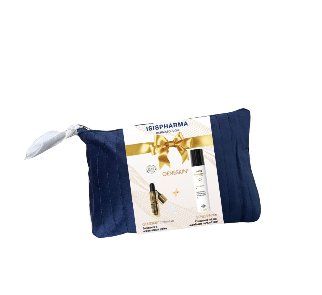 Pachet Promotional GeneSkin – Pouch Albastru Inchis Catifea este o combinatie premium de produse pentru ingrijirea avansata a tenului, cu focus pe iluminare, fermitate si regenerare celulara. Ideal pentru pielea afectata de stres oxidativ, lipsa de luminozitate si primele semne de imbatranire. Contine: 1. Ser Concentrat Iluminator GeneSkin C Premium, 10ml Ser cu 20% vitamina C stabilizata (AA2G), formula antioxidanta puternica ce reface luminozitatea pielii si sustine sinteza de colagen. Proprietati cheie: Vitamina C 20% – uniformizeaza si lumineaza tenul Vitamina E – protejeaza impotriva radiatiilor UV Complex DN-Act – stimuleaza regenerarea celulara Acetyl Hexapeptide-51 – sustine refacerea pielii Utilizare: Pentru efect instant: aplicati dimineata ocazional Ca tratament: aplicati 3 picaturi dimineata si seara, amestecate cu crema 2. Crema Anti-Rid cu Efect de Netezire GeneSkin Lift, 50ml Crema cu textura lejera si efect de netezire, formulata pentru a combate ridurile si lipsa de elasticitate. Ofera protectie anti-poluare si efect anti-age complet. Proprietati cheie: Complex DN-Act – regenerare si fermitate Alge criofile – stimuleaza acidul hialuronic Ulei de jojoba – hranire si hidratare profunda Superoxide Dismutase – actiune antioxidanta si protectie celulara Utilizare: Aplicati dimineata pe fata si gat dupa curatarea tenului. Avantaje pachet: Rutina completa de iluminare si netezire Hidratare, regenerare si protectie antioxidanta Ideal pentru piele lipsita de vitalitate si elasticitate Ambalat intr-un pouch elegant din catifea albastra – perfect pentru calatorii sau cadou Prezentare: Ser: Flacon 10ml Crema: Flacon 50ml Recomandat pentru: Ten tern, matur, cu linii fine si pete pigmentare Persoane care cauta o solutie concentrata pentru luminozitate si regenerare