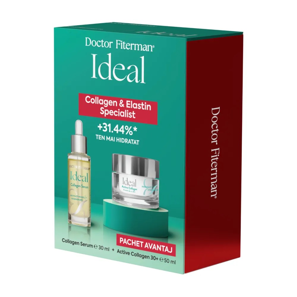 Pachet Ser restructurant Ideal Collagen, 30ml + Crema de zi Ideal Active Collagen 30+, 50ml, Fiterman Ideal Active Collagen, cremă de zi 30+ hidratează natural pielea, îi menține elasticitatea, îi sporește tonusul și o catifelează. 98% nivelul de elasticitate al pielii este mult îmbunătățit; 95% ridurile fine sunt reduse; 97% pielea este mai fermă; 94% pielea este mai luminoasă. Prezentare: 50ml Ideal Collagen Serum , ser restructurant redă luminozitatea tenului, restructurează conturul feței cu 29,59% și hidratează pielea în profunzime. După o lună de aplicare, nivelul de hidratare a pielii crește cu 31,44%, iar pielea devine netedă, catifelată și mătăsoasă. Prezentare: 30ml