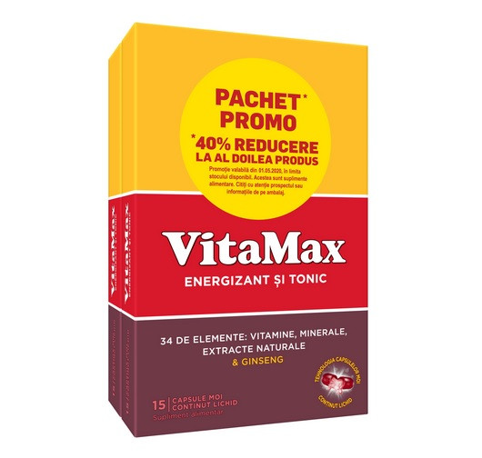 Vitamax Indicatii: Vitamax este indicat ori de cate ori starea mentala sau fizica trebuie sustinuta: tratamentul oboselii, slabiciunii, epuizarii; ameliorarea eficientei mentale si intelectuale si combaterea tulburarilor de concentrare; ameliorarea rezistentei organismului la infectii; pentru scurtarea perioadei de convalescenta dupa diverse boli, interventii chirurgicale, radioterapie; pentru cresterea performantei fizice, in special la atleti; in tratamentul menopauzei si al impotentei psihogene; pentru intarzierea proceselor degenerative ale imbatranirii; pentru alinarea tensiunilor datorate surmenajului; ca parte integranta a tratamentului: neurasteniei si nevritelor, anemiilor prin deficite nutritionale, afectiunilor hepatice, artritelor, ulcerului gastro-intestinal, hiperlipidemiei, diabetului, distrofiilor pielii si anexelor cutanate, parului si unghiilor; in timpul sarcinii si al lactatiei; pentru inducerea starii de confort si stabilitate. Mod de administrare: In absenta unor prescriptii medicale speciale, doza uzuala este de o capsula zilnic sau la doua zile, dupa masa administrata cu o cantitate suficienta de apa. in cazuri severe, doza poate fi crescuta conform recomandarii medicului. Prezentare: 15 + 15 capsule 40%.
