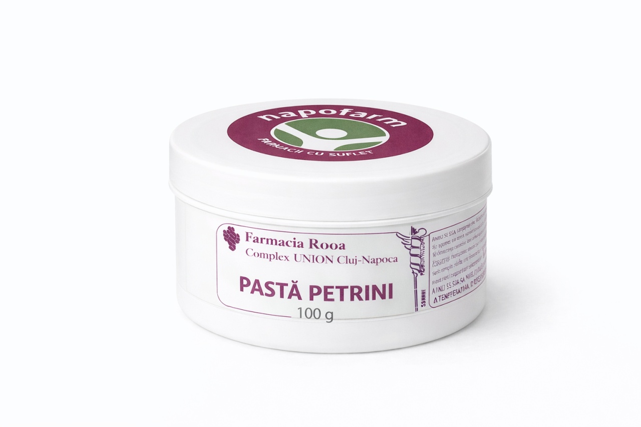 Pasta Petrini Napofarm este o pasta pentru uz extern , ambalata in recipient de 100 g, formulata pentru protectia si ingrijirea pielii. Produsul este destinat utilizarii externe si se aplica conform indicatiilor de pe ambalaj. Formula contine ingrediente cu rol protector si astringent, fiind utilizata in mod traditional pentru ingrijirea zilnica a pielii, inclusiv in cazul pielii sensibile. Actiun