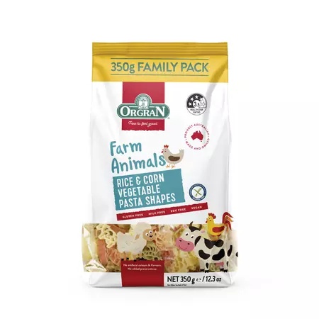 Paste in forma de animale din orez si porumb, 350g, Orgran Colorate și delicioase, pastele în formă de animăluțe de la Organ au fost create special pentru copii năzdrăvani. Pastele în formă de animăluțe din orez și porumb de la Orgran sunt un produs vegetal de calitate, deosebit de nutritiv, care asigură o varietate esențială pentru un regim echilibrat și o stare de bine. Aceste paste au un gust plăcut și sunt ușor de digerat. Nu conțin: gluten, grâu, lapte, ouă, drojdie sau organisme modificate genetic ori ingrediente de origine animală. Mod de preparare: 1. Pentru 350g de paste, fierbeți 4 l