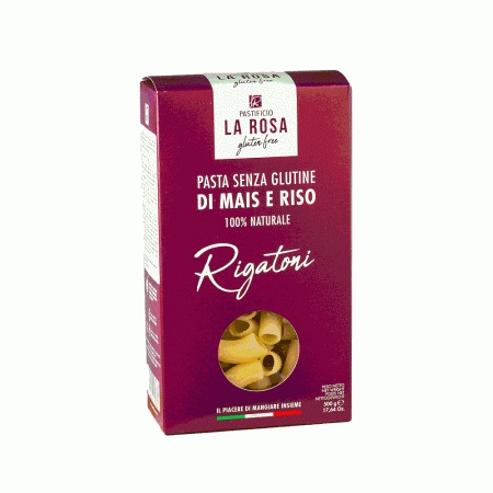 Paste Rigatoni fara gluten, 500g, La Rosa Produs 100% natural, fara oua, fara lapte, fara soia, fara conservanti. 500 g. FARA GLUTEN. Ingrediente: 80% faina de porumb, 20% faina de orez. Timp de gatire: 10 minute. Valori nutritionale medii /100 g de produs: valoare energetica 1524 kJ/356 kcal; grasime 1.5 g, din care acizi grasi saturati 0.5 g; carbohidrati 79 g, din care zaharuri 0.5 g; fibre 2.1 g; proteine 6.4 g; sare sub 0.01 g. Prezentare: 500g