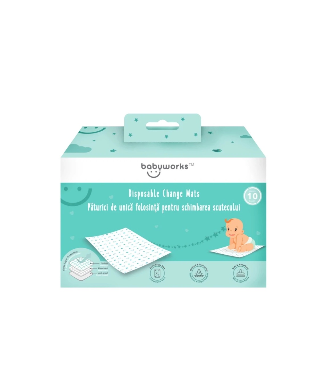 Paturica de unica folosinta pentru schimbarea scutecului, 10 bucati, Baby Works Paturica de unica folosinta Baby Works™ pentru schimbarea scutecului este potrivita pentru utilizarea acasa sau in deplasare. Paturica are 3 straturi protectoare: primul este matlasat, cel de-al doilea este absorbant si al treilea este impermeabil. Stratul superior moale si absorbant este delicat cu pielea bebelusului in timp ce stratul de protectie anti-scurgere impiedica lichidele sa patrunda. Confortabila pentru pielea bebelusului. Prezentare: 10 bucati