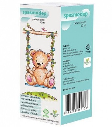 Picaturi orale Spasmodep, 30 ml, Dr. Phyto Proprietati: este un supliment alimentar cu extracte din plante care contribuie la mentinerea aciditatii gastrice normale; roinita, feniculul si musetelul contribuie la reglarea motilitatii gastrointestinale si eliminarea gazelor; musetelul favorizeaza relaxarea; lemnul – dulce sustine functionarea normala a sistemului digestiv; nalba de padure are actiune emolienta asupra sistemului digestiv, sustinand tranzitul normal; complexul de ingrediente active din compozitia produsului contribuie la ameliorarea simptomelor datorate disepsiei functionale, hiperaciditatii gastrice, refluxului gastroesofagian si sindromului de colon iritabil. Ingrediente active per 9 ml: Extract uscat de musetel (Matricaria chamomilla) 135 mg, Apigenina 0.3%, extract uscat de roinita (Melissa officinalis) 135 mg, Acid rozmaric 2%, extract uscat de fenicul (Feniculum vulgare) 108 mg, ulei volatil 1%, extract uscat de nalba de padure (Malva sylvestris) 108 mg, Polizaharide 30%, extract uscat de lemn-dulce (Glycyrrhiza glabra) 54 mg, extract hidrogliceric de galbenele (Calendula officinalis) 54 mg. Mod de administrare: Sugari 6 luni – 2 ani – 0.5 ml de 3 ori pe zi, cu aproximativ 20 de minute inainte de mese direct in cavitatea bucala. Copii cu varste peste 2 ani – 1.5 ml de doua ori pe zi, cu aproximativ 20 de minute inainte de mese diluati intr-o cantitate mica de apa. Adulti – 4.5 ml de doua ori pe zi, cu aproximativ 20 de minute inainte de mese. Prezentare: 30 ml