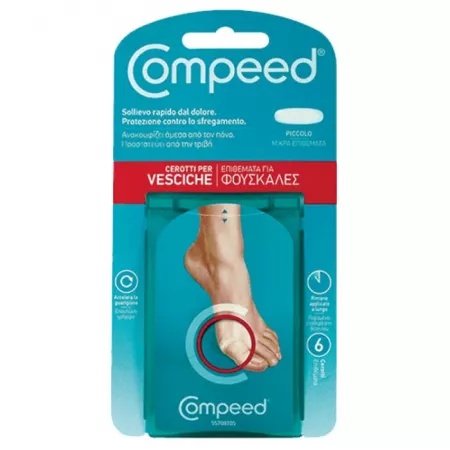 Plasturi mici pentru basici S, 6 bucati, Compeed Plasturi mici pentru basici Compeed Blister Small. Proprietati: obtinut prin tehnologia hidrocoloidala, este un gel activ ce imbunatateste hidratarea; actioneaza ca un al doilea strat de piele, permitand schimburile lichidiene si mentinand echilibrul normal de hidratare; amelioreaza instantantaneu durerea din zona basicii; protejeaza si amortizeaza impotriva frecarii si presiunii; vindeca rapid ranile. Mod de utilizare: 1. Curatati si uscati pielea inainte de utilizare, asigurandu-va ca zona afectata nu este data cu crema sau uleiuri. 2. Indepartati hartia de jos, evitand sa atingeti partea adeziva. 3. Aplicati plasturele ferm peste basica, asigurandu-va ca marginile sunt netezite. 4. Lasati plasturele lipite pana cand acesta incepe sa se desprinda singur. 5. Pentru a indeparta plasturele: nu il dezlipiti, ci intindeti-l pe suprafata pielii. Prezentare: 6 bucati