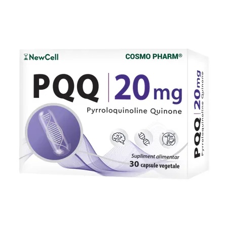 PQQ, 20 mg, 30 capsule vegetale, Cosmopharm PQQ 20 mg Cosmo Pharm este un supliment alimentar ce furnizează Pyrrolochinoline Quinone (PQQ) sub formă de sare disodică, un compus de tip chinonă cu structură unică, prezent în cantități mici în alimente precum soia fermentată, kiwi, ceai verde, papaya și spanac. Produsul este conceput pentru persoanele care doresc un aport suplimentar de PQQ în cadrul unei diete echilibrate și a unui stil de viață sănătos. Proprietăți și beneficii Poate contribui la funcționarea normală a celulelor și la producerea de energie mitocondrială Poate fi util în susținerea răspunsului antioxidant Poate contribui la menținerea vitalității și energiei organismului Mod de administrare 1 capsulă vegetală pe zi, preferabil în timpul mesei sau conform recomandării consultantului de specialitate Ingrediente (per capsulă) PQQ (Pyrroloquinoline Quinone Disodium Salt) – 20 mg Precauții Suplimentele alimentare nu înlocuiesc o dietă variată și echilibrată și un stil de viață sănătos Nu se recomandă depășirea dozei zilnice recomandate A nu se lăsa la îndemâna și vederea copiilor Nerecomandat femeilor însărcinate sau care alăptează Nerecomandat persoanelor alergice la oricare dintre ingrediente Produsul poate prezenta variații organoleptice (culoare, gust, miros) între loturi, fără a afecta calitatea Condiții de păstrare La temperatura camerei, ferit de lumină, căldură excesivă și umiditate Prezentare 30 capsule vegetale