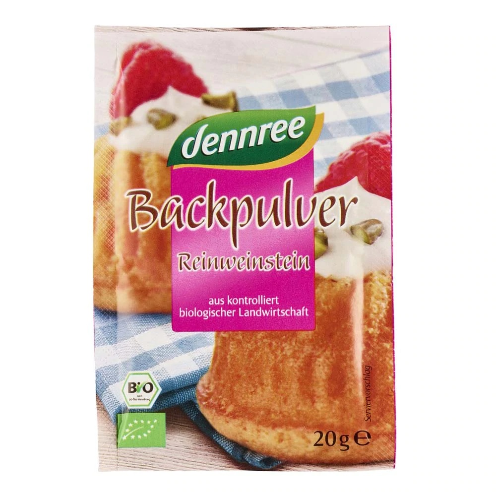 Praf de copt, 4x20g, Dennree Ingrediente: amidon de porumb*, carbonat de sodiu, tartrat de potasiu. *din agricultura ecologica Valori nutritionale/100g: Energie: 1010 kj / 237 kcal, Grasimi: 0.5g din care saturate 0.1g, Carbohidrati: 44g din care zaharuri 0.5g, Proteine: 0.5g, Saruri: 17.1g Un agent de crestere clasic, care se poate folosi in patiserie pentru cresterea si afanarea prajiturilor, fursecurilor si a alor produse asemanatoare. Produs potrivit pentru persoanele vegane, vegetariene. Nu contine gluten. Prezentare: 4 plicuri x 20g