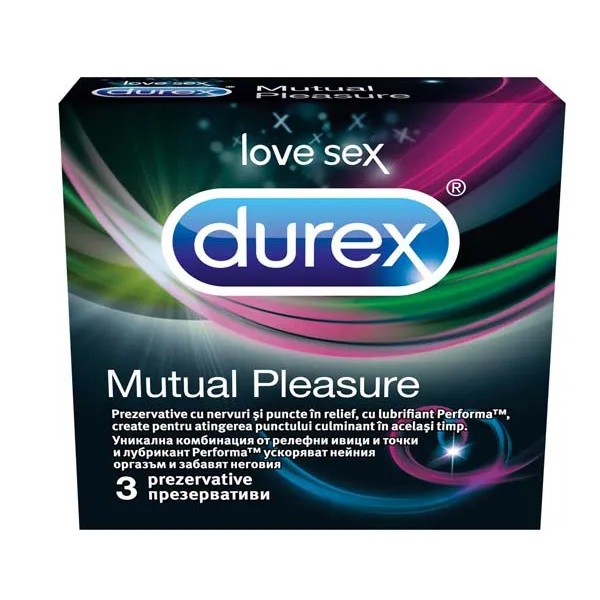 Prezervative Mutual Pleasure, 3 bucati, Durex Durex Mutual Pleasure, prezervative cu nervuri si puncte in relief, cu lubrifiant Performa, create pentru atingerea punctului culminant. Atentie: lubrifiantul de pe prezervativele Durex Mutual Pleasure poate provoca o eruptie cutanata, iritatie, senzatie de arsura sau mancarime. Evitati contactul cu ochii si spalati-va pe maini dupa utilizare. Daca prezentati iritatii, nu mai folositi acest lubrifiant. Daca nu exista nici o ameliorare, consultati medicul. Nu utilizati aceste prezervative daca tu sau partenerul tau aveti pielea inflamata sau crapata. Daca tu sau partenerul tau prezentati dificultati in respiratie sau buzele devin albastre atunci cand utilizati aceste prezervative, opriti utilizarea lor imediat si sunati un medic. Ejacularea prematura este o problema des intalnita, care poate avea multe cauze si care poate necesita consultarea/supravegherea unui medic. Daca aceste prezervative nu ajuta, discutati cu medicul dvs. Conditii de pastrare: a se pastra la loc uscat si racoros, ferit de razele soarelui. Prezervative: 3 bucati