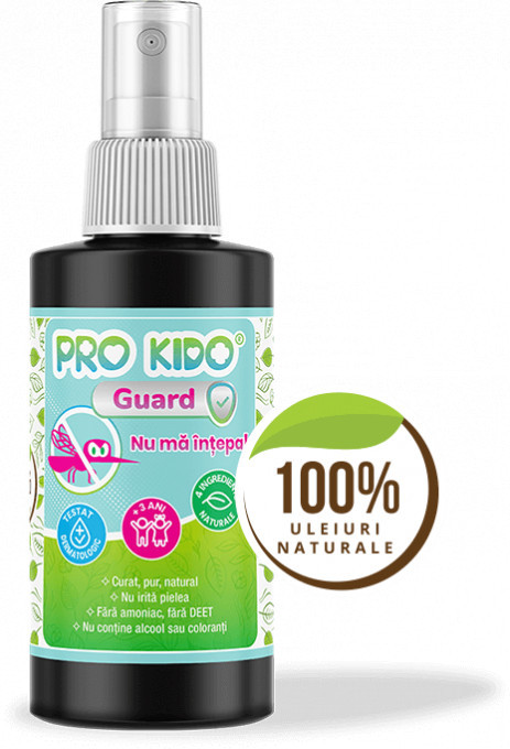 Pro Kido Guard Spray Anti-Tantar, 100 ml Protectie naturala pentru pielea sensibila a copiilor Pro Kido Guard – Nu ma inteapa! este un spray anti-tantar formulat cu ingrediente naturale, creat special pentru pielea sensibila si potrivit pentru copii de la 3 ani. Caracteristici principale: Protectie naturala impotriva tantarilor Formula fara alcool, amoniac, parfum si coloranti Fara DEET, non-toxic Testat dermatologic, sigur pentru copii Contine 4 uleiuri esentiale: lavanda, rozmarin, lemongrass si busuioc Imbogatit cu pantenol pentru hidratarea pielii Ofera senzatia de revigorare si prospetime Aplicare usoara sub forma de spray Mod de utilizare: Aplicati uniform pe pielea expusa, evitand ochii si gura. Reaplicati la fiecare 4-6 ore sau dupa nevoie.