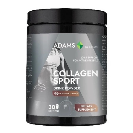 Pudra instant cu aroma de ciocolata Collagen Sport Active Line, 600g, Adams Proprietati: colagenul este cea mai abundenta proteina din organisum uman. Ea serveste ca si elementul principal in constructia pielii, tendoanelor, muschilor, ligamentelor si a vaselor de sange; colagenul din bovine prezinta multe beneficii pentru sanatate, poate contribui la ameliorarea simptomelor osteoartritei, la imbunatatirea sanatatii pielii; poate mentine articulatiile sanatoase, imbunatateste masa muscualra; poate preveni accidentarile din timpul antrenamentelor; sursa de proteina ideala; poate creste performanta sportiva; MSM (metilsulfonilmetan) poate sprijini un raspuns inflamator sanatos si este considerat a fi un analgezic natural, poate creste mobilitatea articulara; vitamina C poate contribui la formarea normala a colagenului pentru functionarea normala a vaselor de sange, a dintilor, a gingiilor, a pielii a sistemului ososs si a ligamentelor; magneziul poate contribuie la mentinerea sanatatii sistemului osos, a dintilor, la echilibrul electrolitic si la functionarea normala a sistemului osos. Mod de administrare: 1 portie (20 g = 1 lingurita dozatoare) de pulbere dizolvata cu ajutorul unui shaker in 200 ml de apa (lapte, ceai, dupa preferinta) pe zi. Ingrediente: Pulbere de colagen hidrolizat de bovine, maltodextrina, metilsulfonilmetan (MSM), carbonat de calciu, gluconat de magneziu, aroma naturala de ciocolata, colorant (cacao degresat), acid ascorbic, corector de aciditate (acid citric), indulcitor (sucraloza). Precautii: A nu se depasi doza pentru consumul zilnic. Suplimentele alimentare nu ar trebui sa inlocuiasca o dieta variata si echilibrata si un stil de viata sanatos. Produs interzis copiilor. Prezentare: 600g