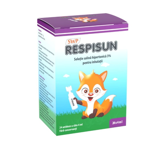 Respisun Descriere Respisun este o solutie salina hipertonic 3% recomandata in bronsiolita, fibroza chistica si bronsiectazie. Produsul actioneaza prin efect osmotic, determinand mobilizarea secretiilor din tractul respirator inferior si contribuind la fluidizarea lor. In acelasi timp, previne uscarea mucoasei bronsice. Compozitie Clorura de sodiu – 3 g, apa purificata qs ad 100 ml. Mod de admin