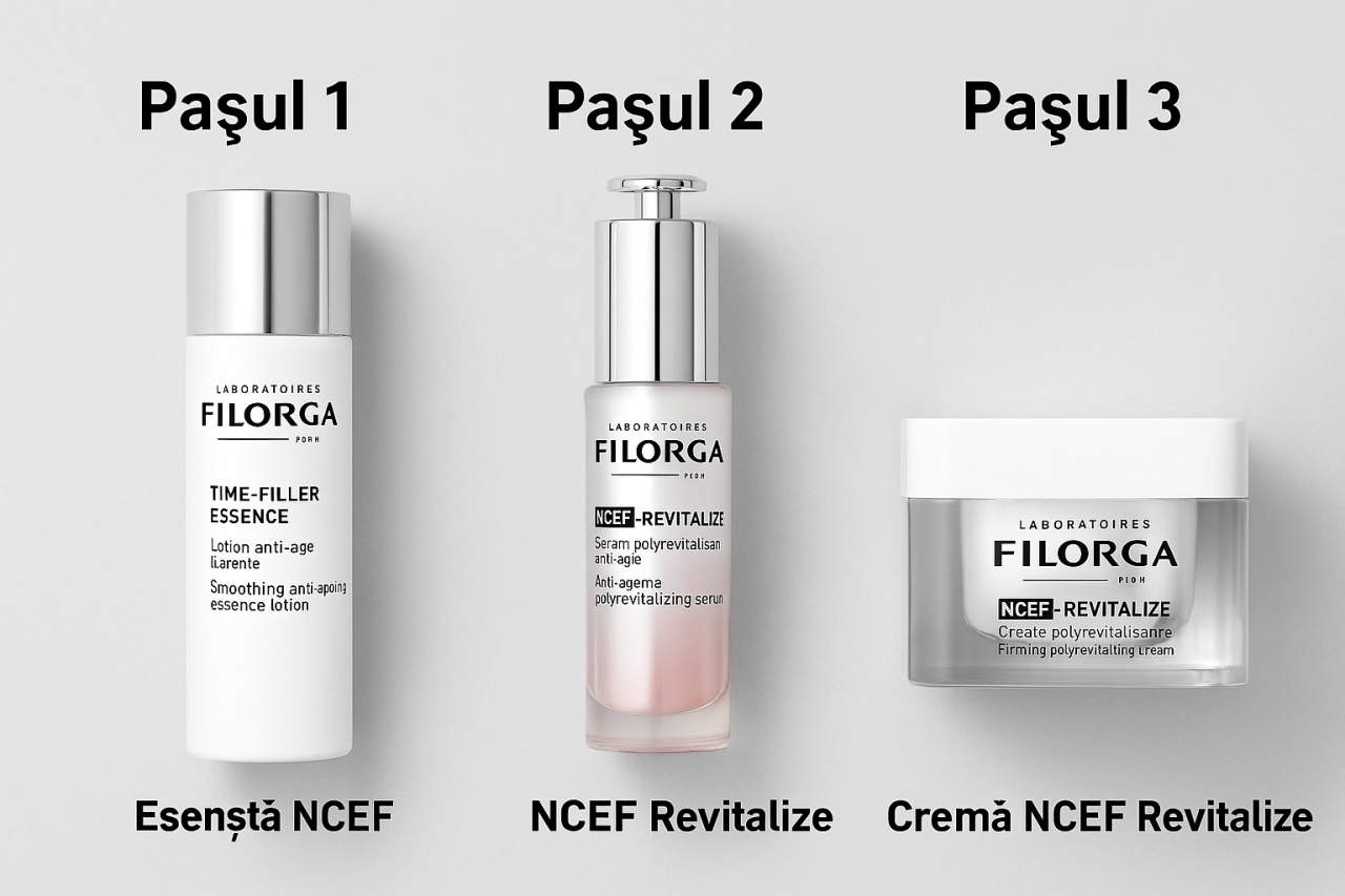 Pachet Revitalizare si Fermitate Filorga NCEF Filorga NCEF este gama polirevitalizanta pentru o piele mai ferma, neteda si luminoasa. Pachetul contine: NCEF Essence 150 ml – pregateste pielea, stimuleaza regenerarea si maximizeaza eficienta tratamentelor urmatoare; NCEF Revitalize Serum 30 ml – ser intens cu acid hialuronic, vitamine si antioxidanti pentru regenerare si netezire; NCEF Revitalize Crema 50 ml – crema anti-age, ofera fermitate, corecteaza ridurile si imbunatateste aspectul tenului. Ideal pentru pielea matura sau lipsita de vitalitate. Rutina NCEF asigura revitalizare globala si corectie anti-age de lunga durata.
