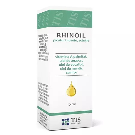 Rhinoil picături nazale, soluţie este indicat ca adjuvant în tratamentul rinitelor și rino-faringitelor acute și cronice, în sinuzite, în rinita cronică atrofică simplă, în ozenă, în edem postoperator al mucoasei după intervenții endonazale. Contraindicatii: Hipersensibilitate la oricare din componenţii produsului. Precautii: Înainte să utilizaţi Rhinoil picături nazale, soluţie, adresaţi-vă medicului dumneavoastră sau farmacistului. Sarcina, alăptarea și fertilitatea: Produsul nu se administrează femeilor gravide sau celor care alăptează. Conducerea vehiculelor şi folosirea utilajelor: Produsul nu influenţează capacitatea de a conduce vehicule sau de a folosi utilaje. Mod de administrare: Luați întotdeauna acest medicament exact așa cum este descris în acest prospect sau așa cum v-a spus medicul dumneavoastră sau farmacistul. Discutați cu medicul dumneavoastră sau cu farmacistul dacă nu sunteți sigur. Copii peste 7 ani: Doza recomandată este de 1-2 picături, în fiecare nară, administrate sub formă de instilații sau tamponament nazal de 2 ori pe zi, timp de 4 zile sau la indicația medicului. Adulți: Doza recomandată este de 2-3 picături, în fiecare nară, administrate sub formă de instilații sau tamponament nazal de 3 ori pe zi, timp de 5-6 zile sau la indicația medicului. Dacă aveți orice întrebări suplimentare cu privire la acest medicament, adresați-vă medicului dumneavoastră sau farmacistului. Compozitie: Picăturile nazale 100 ml RHINOIL conțin: vitamina A palmitat 0.9 g, ulei de anason 0.8 g, ulei de eucalipt 0.7 g, ulei de mentă 0.6 g, camfor 0.15 g și excipienți. Prezentare: 10ml Atentionare: Citiţi cu atenţie şi în întregime prospectul înainte de a începe să utilizaţi acest medicament deoarece conţine informaţii importante pentru dumneavoastră.
