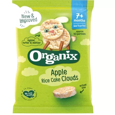Rondele din orez cu mere bio, +7 luni, 40g, Organix Organix rondele ecologice din orez expandat acoperite cu suc de mere si scortisoara. Rondele usoare si crocante. Potrivit incepand cu varsta de 7 luni, cu o dimensiune ideala pentru micile maini (Fingerfood). Organix exista pentru a produce mancare delicios de gustoasa, totalmente ecologica, care ofera o stare de bine si stimuleaza curiozitatea micutului tau. In acest fel pot explora prin joaca si experimenta gustul delicios cu orice ocazie. Acum ambalajul este resigilabil cu ajutorul benzii adezive (Peel me. Reseal me) de pe spatele ambalajului. Fara zahar adaugat Ecologic Fara coloranti sau arome artificiale Potrivit pentru vegetarieni si vegani Fara gluten Gustul vine din fructe Compozitie: Orez ecologic 84,9%, suc ecologic concentrat de mere 14,8%, pudra ecologica de scortisoara 0,2%, Tiamina (Vitamina B1 ) – fara certificare ecologica Prezentare: 50g