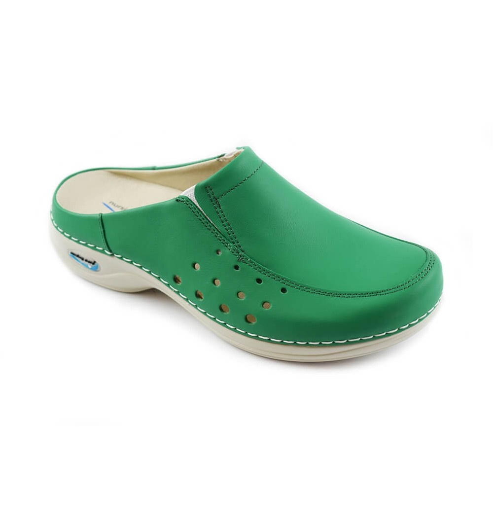 Saboti medicali Nursingcare Wash’Go gama Berlin, verde (green) Wash’Go – Incaltaminte pentru uz profesional, cu un aspect elegant, realizata din materiale rezistente la uzura. Talpa usoara si flexibila din poliuretan asigura un confort optim pe tot parcursul zilei datorita formei ergonomice. Caracteristici: Partea superioara din piele naturala Captuseala din microfibra Brant din microfibra + poliuretan Model unisex, cu elastic si orificii laterale pentru aerisire Ideali pentru domeniul medical Talpa anti-alunecare din poliuretan Spalare la nevoie in masina de spalat la 30ºC, dar fara stoarcere! Fabricat in Portugalia Prezentare: 1 pereche, marimea 36