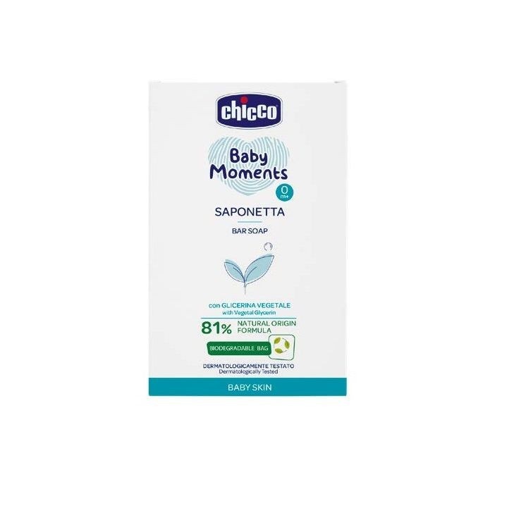 Sapun solid Baby Moments 0l+, 100g, 10398-9, Chicco Baby Moments Baby Skin este o gama completa de produse special concepute sa aibe grija de pielea bebelusului in fiecare zi. Contine: glicerina vegetala si extracte naturale are un miros delicat si usor recognoscibil. produsele sunt testate dermatologic si oftalmologic. ambalaj din plastic reciclat 100% Caracteristici si beneficii: formula pe baza de glicerina vegetala 81% ingrediente naturale produs testat dermatologic; respecta echilibrul hidrolipidic al pielii bebelusului care este subtire si delicata ambalaj reciclabil 100% Prezentare: 100g