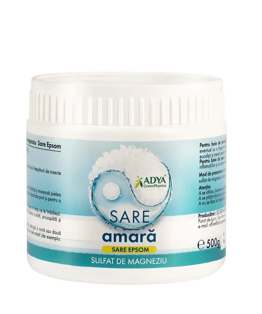 Sare amara Epsom, 500g, Adya Green Pharma Sărurile Epsom sunt eficiente în eliminarea toxinelor de la locul înțepăturilor de insecte și facilitează îndepărtarea așchiilor din piele. Acestea sunt benefice și pentru curățarea porilor. Pentru curățarea porilor, poți dizolva 1/2 linguriță de sare într-un pahar cu apă călduță și să masezi pielea pentru a îndepărta punctele negre, deschizând și curățând porii, și pentru a revitaliza pielea. În timpul baiei, poți masca pielea cu o mână plină de sare Epsom, exfoliind astfel pielea și lăsând-o curată, proaspătă și catifelată. Pentru relaxarea mușchilor suprasolicitați, poți adăuga o cană sau două de sare în apa fierbinte de baie, împreună cu uleiuri esențiale (de exemplu, lavandă, eucalipt, mentă, portocală). Pentru o baie de picioare, poți adăuga 1-2 linguri de sare Epsom, eventual combinate cu o lingură de bicarbonat de sodiu și uleiuri esențiale de eucalipt și mentă pentru un efect relaxant de „picioare ușoare”. Pentru o baie de șezut, poți folosi 1-2 lingurițe de sare pentru a ameliora inflamațiile și simptomele hemoroizilor. Precautii: A se utiliza, înainte de sfârșitul datei de expirare înscrisă pe ambalaj. A se păstra ferit de caldură, lumină și umiditate. A nu se lăsa la îndemâna și vederea copiilor. Ingrediente: Sulfat de magneziu, cristale 500g. Prezentare: 500g sulfat de magneziu cristale