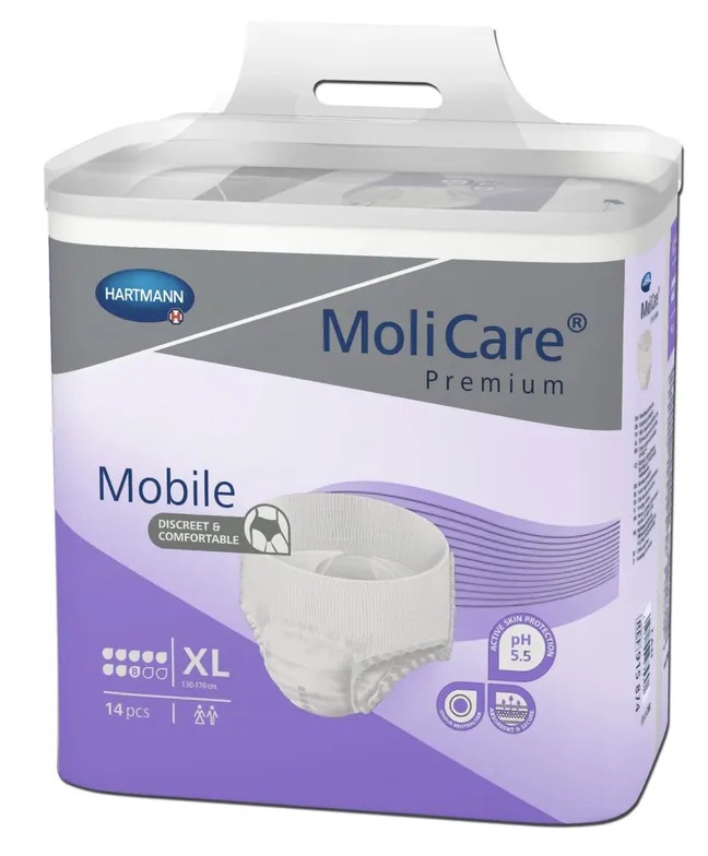Scutece chilot adulti MoliCare Premium Mobile 8pic XL, 14buc, Hartmann Slipurile pentru scurgeri urinare MoliCare Mobile Premium XL 8 picături sunt concepute pentru protecție eficientă în cazurile de incontinență moderată până la severă. Aceste slipuri absorbante oferă o capacitate mare de absorbție de până la 2421 ml, asigurând confort și siguranță pe durata întregii zile. Datorită designului inovator, slipurile se poartă și arată ca lenjeria intimă obișnuită, oferind utilizatorilor o senzație naturală și discreție maximă. Disponibile în trei variante adaptate nevoilor: Light (scurgeri moderate), Extra (scurgeri abundente, în special pe timpul zilei) și Premium pentru protecție sporită. MoliCare Mobile este ideal pentru pacienții mobili, asigurând libertate de mișcare și confort. De asemenea, personalul medical va aprecia ușurința cu care pot fi manevrate, fiind o soluție practică și igienică, recomandată și pentru pacienții cu demență sau hiperactivi.