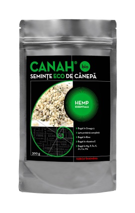 Seminte decorticate de canepa bio, 300g, Canah Sursă importantă de proteină completă, ce conţine toţi aminoacizii esenţiali. În plus, proteină din seminţele de cânepă are o compoziţie specială, 65% proteină globulară numită edestina şi 35% albumina. Ambele sunt bogate în aminoacizi, sunt uşor de digerat şi absorbit de către corpul uman. Oferă o bogăţie de vitamine şi minerale şi un aport de fibre vegetale. Seminţele de cânepă prezintă, în mod natural, un raport ideal pentru organismul uman de 3:1 între Omega 6 şi Omega 3. Acizii graşi alfa-linolenic (AAL, componentă Omega 3) şi linoleic (AL, componentă Omega 6) contribuie la menţinerea concentraţiilor normale ale colesterolului din sânge. Acizii graşi esenţiali sunt necesari şi dezvoltării şi creşterii normale a copiilor. Aceste efecte benefice sunt obținute la un consum zilnic de 2g de AAL şi de 10g de AL O porţie de 30g de seminţe de cânepă Hemp Essentials oferă 10g de proteină, 1,8g de fibre, 2g de acid alfa-linoleic (AAL), 8g de acid linoleic (AL) şi mai puţin de 1g de carbohidraţi. Seminţele de cânepă Hemp Essentials sunt o excelenţă sursă vegetală de proteine, consituind un posibil substituent pentru proteină de origine animală; jucând astfel un rol important în dietă vegetariană, vegană şi raw-vegană. Datorită faptului că nu au fost depistaţi alergeni în compoziţia seminţelor de cânepă şi a grijii cu care Canah face selecţia materiei prime, seminţele de cânepă decorticate Hemp Essentials sunt potrivite pentru persoanele care au intoleranţă la lactoză sau gluten şi pentru cei sensibili la alţi alergeni. Mod de consum: Bogăţia de vitamine şi minerale din seminţele de cânepă cresc valoarea nutritivă a oricărui preparat în care acestea sunt adăugate. Da frâu liber creativităţii cu seminţele de cânepă. Include-le în prepararea snacks-urilor delicioase, presară-le peste salate sau paste, adaugă-le în reţeta ta preferată de prăjituri sau energizează-ţi dimineţile cu granola de cânepă, cu shakeuri din fructe şi legume cu adaos de seminţe de cânepă. Cele mai delicioase preparate fără lactoză ce pot substitui lactatele (lapte, unturi şi chiar şi brânzeturi) pot fi pregătite din seminţe de cânepă decorticate Hemp essentials. Ele se pot consumă şi simple, că gustare. Odată ce le-ai testat , este greu să rezişti gustului şi texturii untoase deosebit de plăcute. Recomandăm 3 linguri (30g) de seminţe decorticate de cânepă zilnic. Dacă nu ai mai consumat până acum, poţi creşte cantitatea progresiv până la valoarea recomandată. Dacă eşti în căutarea unor idei de preparate cu seminţe de cânepă, vezi secţiunea reţete (sub formă de link). Păstrează produsul în loc uscat, ferit de razele soarelui iar după desigilare la frigider. Ambalajul este prevăzut cu un sigiliu încorporat, tip „fermoar”. Prezentare: 300g