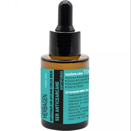 Ser anticearcane, 30ml, Herbagen Proprietati: ser anticearcăne, antipungi dedicat reducerii petelor și pungilor de sub ochi, conține cele mai eficiente ingrediente active 100% de origine naturală; cel mai avansat sistem de penetrare a epidermei format din particule Niosom, încărcate cu Tetrapeptide-7, Diosmin și Forskolin; niosomii sporesc eficacitatea ingredientelor active incapsulate îmbunătățind penetrarea prin barieră impermeabilă a stratului cornos; diosmin reduce lichidul capilar prin diminuarea mediatorilor inflamatori (TNF-a) și vasodilatatori (NO); forskolin promovează descompunerea depunerilor de grăsime, crescând nivelurile intracelulare de cAMP pentru a stimula reducerea pungilor formate sub ochi; Palmitoyl Tetrapeptide-7 stimulează drenajul fluidelor de către sistemul limfatic prin reducerea IL-6 și în consecință, reducerea edemului pleoapelor; filtrat (extract) de melc diminuează, petele pigmentare, ridurile, inflamațiile; niacinamida reducere ridurile, petele și inflamațiile; d-panthenol permite pielii să rețină hidratarea și reduce inflamațiile; venin de vipera redă un aspect întinerit, fiind o variantă topică pentru relaxarea musculară, comparativ cu injecțiile cu botox. Mod de utilizare: Se aplica 2-3 picături sub pleoapa inferioară și se masează circular. Poate fi utilizat și ca suport pentru farduri, anticearcăn sau creme de protecție solară. Ingrediente: Aqua, Snail secretion filtrate, Glycerin, Diosmine, Palmitoyl Tetrapeptide-7,Coleus Forskohlii Root Extract, Polyglyceryl- 10 Laurate, Polyglyceryl -4 Caprate, Sorbitan Oleate, Niacinamide, Polyquaternium-37, Panthenol, Sodium Benzoate, Potassium Sorbate, Phenoxyethanol, Ethylhexylglycerin, Viper Venom. Prezentare: 30ml