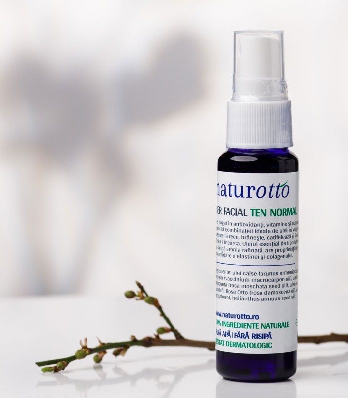 Ser facial pentru ten normal, 25ml, Naturotto Serul facial pentru ten normal este un răsfăț pentru piele. Este conceput din uleiuri vegetale ușoare, neprocesate termic, pătrunde ușor în piele, hidratează, catifelează și oferă pielii luminozitate și confort. Uleiul esențial de trandafir Rose Otto, pe lângă parfumul discret și rafinat, are proprietăți de tonifiere și consolidare a elastinei și colagenului. Recomandat pentru: TEN MATUR, TEN DESHIDRATAT, TEN SENSIBIL Beneficii: menține echilibrul de hidratare a pielii tonifică și îmbunătățește elasticitatea pielii menține aspectul sănătos al tenului asigură o hrănire intensă a tenului prin formula concentrată, fără apă, din surse 100% naturale bogate în nutrienți Ingrediente: ulei de caise, ulei de merișor, ulei de rosa mosqueta, ulei esențial Rose Otto, vitamina E Uleiul de caise asigură menținerea echilibrului de umiditate a pielii. Uleiul de merișor are un conținut ridicat de antioxidanți naturali, este un filtru UV natural, antirid și purifiant de excepție. Uleiul de rosa mosqueta este un ulei absolut remarcabil având, pe lângă alte calități deosebite, proprietăți de îmbunătățire a tonusului pielii și o valoare nutritivă ridicată pentru derm, refăcând și reparând pielea din interior. Uleiul esential Rose Otto (cunoscut și ca Rose of Bulgaria) este un ulei esențial special (pentru producerea unui ml de ulei esențial sunt folosite petalele a 60.000 de trandafiri), cu proprietăți absolut deosebite. Pe lângă parfumul depsebit, tonifiază și consolidează rețeaua de elastina și colagen, rețea ce menține pielea moale, suplă și radiantă. Fiecare ingredient din formula produsului are un rol activ benefic. Prin procesul de manufacturare folosit sunt păstrate toate proprietățile ingredientelor, nefiind procesate termic. Prezentare: 25ml
