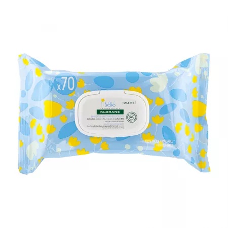 Servetele umede pentru copii, 70 bucati, Klorane Bebe Proprietati: îmbogățite cu ingrediente active blânde pe bază de plante pentru a purifica, hidrata și proteja pielea; confecționate din fibre naturale 100% biodegradabile și depozitate într-un ambalaj resigilabil; șervețelele nu necesită clătire, pentru o spălare ușoară în afara casei; formula cu 98% ingrediente naturale calmează roșeața și combate uscăciunea; piele este moale, hidratată și protejată pentru un moment de îngrijire învăluit într-un parfum tandru. Mod de utilizare: Curățați cu una sau mai multe șervețele până când pielea este curată. Nu este nevoie să clătiți. Ingrediente: WATER (AQUA), GLYCERIN, PEG-40 HYDROGENATED CASTOR OIL, CALENDULA OFFICINALIS FLOWER EXTRACT, CAPRYLYL GLYCOL, CITRIC ACID, COCO-GLUCOSIDE, FRAGRANCE (PARFUM), ISOLEUCINE, POLYSORBATE 80, PROPYLENE GLYCOL, SODIUM BENZOATE Prezentare: 70buc