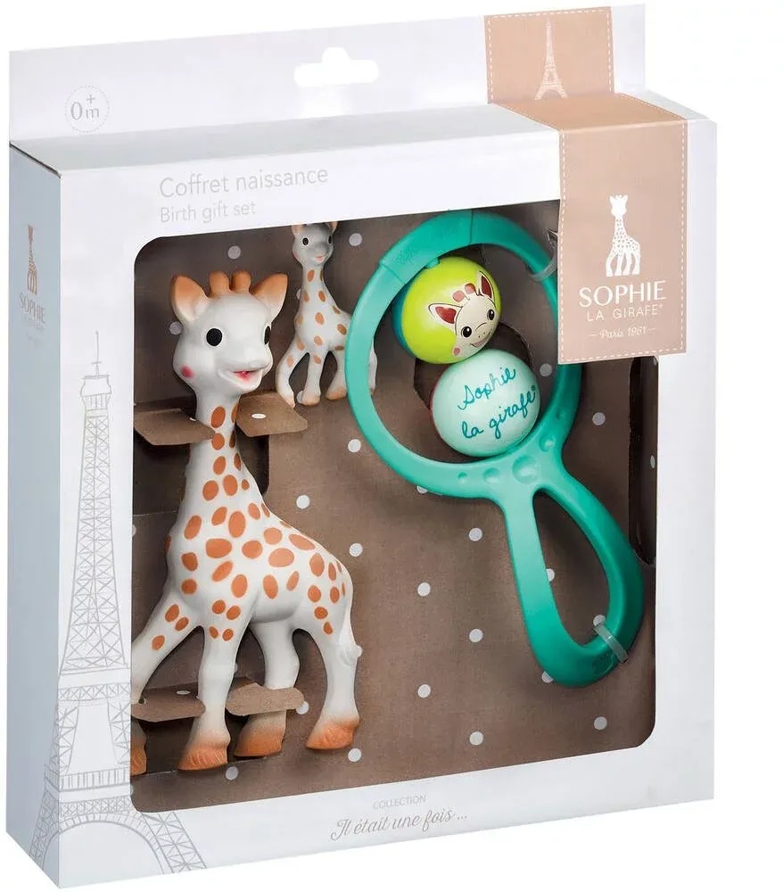 Set cadou Girafa Sophie cu zornaitoare swing si breloc, +0 luni, 010324, Vulli Un set elegant pentru a fi oferit cadou, ce o contine pe celebra Sophie, impreuna cu zornaitoare colorata, si un breloc Girafa Sophie,cadou pentru mamica! Caracteristicile Girafei Sophie: Poate fi utilizata de la 0 luni. Prima jucarie a bebelusului care-i stimuleaza toate simturile; Vederea: datorita petelor sale de culoare inchisa, contrastante care se gasesc pe tot corpul girafei atrag privirea bebelusului si devin un obiect familiar si linistitor; Auzul: dotata cu un fluier, este amuzanta si totodata stimuleaza auzul bebelusului si il ajuta sa inteleaga relatia dintre cauza si efect; Gustul: girafa Sophie este foarte flexibila si bebelusul o poate mesteca, este ideala pentru calmarea gingiilor copilului in perioada eruptiilor dentare; Fabricata din cauciuc 100% natural si pictata cu coloranti alimentari , nu este deloc periculoasa pentru micutul dumneavoastra; Simtul tactil: foarte usoara, girafa Sophie este perfect adaptata manutelor mici ale bebelusului, iar picioarele sale lungi si gatul o fac usor de apucat. Fina la atingere, ca si pielea mamei, girafa are efecte linistitoare asupra bebelusului; Mirosul: mirosul aparte al cauciucului extras din arborele de Hevea o face pe Sophie sa fie usor de recunoscut de catre bebelus dintre toate jucariile sale. Mod de utilizare: Nu sterilizati, curatati cu o carpa curata si umeda. Girafa nu va mai piui daca intra apa in ea. Tineti departe de surse de caldura. Prezentare: Dimensiuni jucarie: inaltime 17 cm. Caracteristici Zornaitoare “Swing” 3 luni + Vulli a creat aceasta zornaitoare usoara si frumos colorata , cu formele rotunjite pentru a fi simplu de manevrat de catre bebelus. Culorile vii, si sunetele produse vor stimula simturile bebelusului si il vor ajuta sa inteleaga relatia dintre cauza si efect. Are 2 bile viu colorate, cu imaginea Girafei Sophie, care se invart , spre amuzamentul bebelusului. Produsul este ambalat intr-o cutie de carton, si este disponibil in 2 variante de culori : verde deschis si verde menta. Detaliile si culorile produsului pot varia. Mod de utilizare: Nu sterilizati produsul! Nu lasati ambalajele la indemana copilului! La primele semne de deteriorare, incetati utilizarea produsului! Poate fi curatat cu o carpa umeda. Atentie: brelocul nu este o jucarie, va rugam nu il dati copilului!