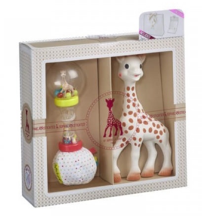 Set girafa Sophie si zornaitoare Sophie 0L+, SOPHIEsticat, Vulli Caracteristicile Girafei Sophie: Poate fi utilizata de la 0 luni. Prima jucarie a bebelusului care-i stimuleaza toate simturile! Vederea: datorita petelor sale de culoare inchisa, contrastante care se gasesc pe tot corpul girafei atrag privirea bebelusului si devin un obiect familiar si linistitor. Zornaitoarea este fabricata din poliester și de bumbac. Auzul: dotata cu un fluier, este amuzanta si totodata stimuleaza auzul bebelusului si il ajuta sa inteleaga relatia dintre cauza si efect. Gustul: girafa Sophie este foarte flexibila si bebelusul o poate mesteca, este ideala pentru calmarea gingiilor copilului in perioada eruptiilor dentare. Fabricata din cauciuc 100% natural si pictata cu coloranti alimentari , nu este deloc periculoasa pentru micutul dumneavoastra. Simtul tactil: foarte usoara, girafa Sophie este perfect adaptata manutelor mici ale bebelusului, iar picioarele sale lungi si gatul o fac usor de apucat. Fina la atingere, ca si pielea mamei, girafa are efecte linistitoare asupra bebelusului. Mirosul: mirosul aparte al cauciucului extras din arborele de Hevea o face pe Sophie sa fie usor de recunoscut de catre bebelus dintre toate jucariile sale. Dimensiuni jucarie: inaltime 17 cm