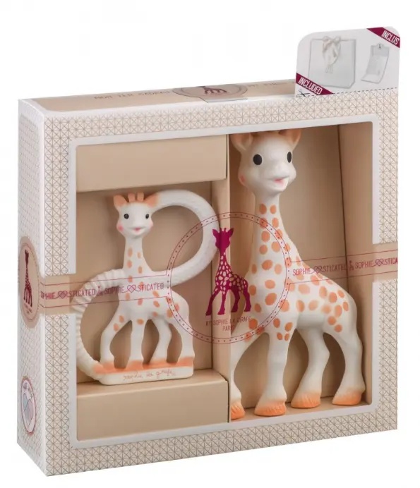 Set pentru dentitie SOPHIEsticat Setul reuneste doua produse foarte bine cunoscute: Girafa Sophie originala si un inel de dentitie Bio (acesta este de dimensiuni mai mici si cu texturie diferite). Ambele produse sunt fabricate 100% din cauciuc natural. Setul este ambalat intr-o cutie eleganta si contine o felicitare pentru a va personaliza mesajul pentru proaspetii parinti. Caracteristicile Girafei Sophie: Poate fi utilizata de la 0 luni Prima jucarie a bebelusului care-i stimuleaza toate simturile! Vederea : datorita petelor sale de culoare inchisa, contrastante care se gasesc pe tot corpul girafei atrag privirea bebelusului si devin un obiect familiar si linistitor. Auzul: dotata cu un fluier, este amuzanta si totodata stimuleaza auzul bebelusului si il ajuta sa inteleaga relatia dintre cauza si efect. Gustul: girafa Sophie este foarte flexibila si bebelusul o poate mesteca, este ideala pentru calmarea gingiilor copilului in perioada eruptiilor dentare. Fabricata din auciuc 100% natural si pictata cu coloranti alimentari , nu este deloc periculoasa pentru micutul dumneavoastra. Simtul tactil: foarte usoara, girafa Sophie este perfect adaptata manutelor mici ale bebelusului, iar picioarele sale lungi si gatul o fac usor de apucat. Fina la atingere, ca si pielea mamei, girafa are efecte linistitoare asupra bebelusului. Mirosul: mirosul aparte al cauciucului extras din arborele de Hevea o face pe Sophie sa fie usor de recunoscut de catre bebelus dintre toate jucariile sale. Dimensiuni jucarie: inaltime 17 cm