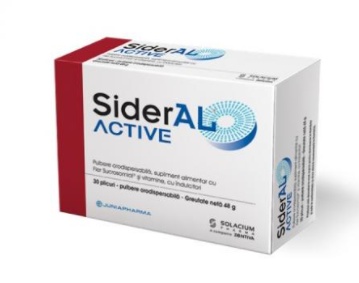 SiderAL ACTIVE Proprietati: Pulbere orodispersabilã, supliment alimentar cu Fier Sucrosomial® şi vitamine, cu îndulcitori. SiderAL® ACTIVE este un supliment alimentar cu Fier Sucrosomial® (Sideral® r.m.), vitamina C și vitamine din complexul B, utilizat pentru compensarea deficitelor nutritive sau în momentele în care există o nevoie crescută pentru acești nutrienți. Fierul contribuie la funcția cognitivă normală a copiilor. Fierul contribuie la formarea normală a globulelor roșii și a hemoglobinei. Ingrediente: – îndulcitori: xilitol, sorbitol, sucraloză, acesulfam de potasiu; Fier Sucrosomial® – Sideral® r.m. (pirofosfat de fier, amidon de orez pregelatinizat, esteri de sucroză ai acizilor grași, lecitină din Floarea-soarelui, sirop de glucoză, proteine din lapte, agent antiaglomerant: fosfat tricalcic); Vitamina C/acid L-ascorbic; arome: cola, lămâie, vanilie, mentă; corector de aciditate: acid citric anhidru; Vitamina B12/cianocobalamină 0,1% (maltodextrină, citrat trisodic, acid citric); Vitamina B6/clorhidrat de piridoxină; Acid folic/acid pteroilmonoglutamic. Nu conține gluten. Ingrediente active: Fier 14 mg Vitamina C 48 mg Vitamina B6 1.00 mg Acid Folic 150 mg Vitamina B12 2,00 mg Mod de administrare: – un plic pe zi, al cărui conținut se dizolvă direct în gură. Precautii: Produsul conține proteine din lapte. Contraindicat persoanelor alergice la proteinele din lapte sau la oricare dintre ingredientele produsului. A nu se utiliza de către copiii cu vârstă sub 3 ani. Preparatul conține polialcooli, consumul în exces poate avea efect laxativ. Atentionari: A nu se lăsa la îndemâna și la vederea copiilor mici. A nu se depăși doza recomandată pentru consumul zilnic. Produsul este un supliment alimentar și nu trebuie să înlocuiască o dietă variată și echilibrată și un stil de viață sănătos. Termenul de valabilitate inscripționat pe ambalaj este valabil în cazul produsului sigilat și păstrat în condițiile specificate. Prezentare: 30 plicuri