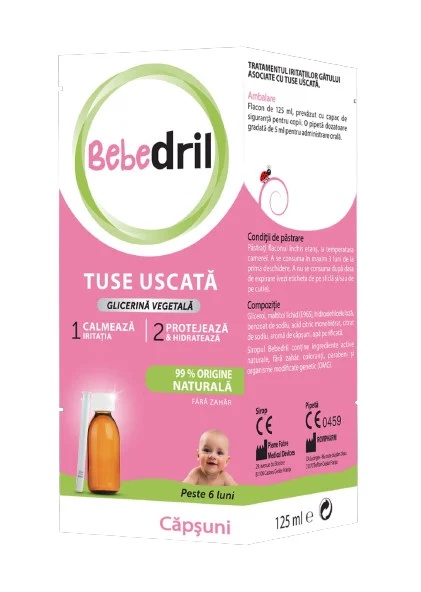 Sirop Bebedril pentru tuse uscata, 125 ml – Pierre Fabre Healthcare Descriere produs: Siropul Bebedril, destinat copiilor între 6 luni și 6 ani, este o soluție eficientă pentru calmarea tusei uscate. Cu o formulă fără zahăr, coloranți și parabeni, acest sirop are o aromă plăcută de căpșuni și oferă un strat protector și emolient pentru mucoasa gâtului, reducând iritațiile cauzate de tuse. Bebedril este ideal pentru bebeluși și copii mici, ajutând la ameliorarea tusei uscate, inclusiv a celei cauzate de factori externi precum fumul de țigară, poluarea sau aerul uscat. Beneficii: Formulă fără zahăr, parabeni și coloranți. Potrivit pentru sugari de la 6 luni și copii până la 6 ani. Calmează și protejează gâtul iritat. Eficient împotriva tusei uscate provocate de factori externi (fum, praf, poluare). Aromă plăcută de căpșuni, ușor acceptată de copii. Ingrediente active: Glicerol Maltitol lichid (E965) Hidroxietilceluloză Benzoat de sodiu Acid citric monohidrat Citrat de sodiu Aromă de căpșuni Apă purificată Mod de administrare: Folosiți pipeta de dozaj inclusă pentru a administra doza corectă: Sugari între 6 și 12 luni: 5 ml per administrare, de 3-4 ori pe zi, dacă este necesar. Copii între 1 și 6 ani: 10 ml per administrare, de 3-4 ori pe zi, dacă este necesar. Atenționări: Dacă tusea persistă mai mult de 3 zile sau apar simptome severe precum febră, respirație dificilă sau modificări comportamentale, consultați medicul. Siropul nu este recomandat sugarilor sub 6 luni sau celor cu intoleranță ereditară la fructoză. Contraindicații: Alergie la oricare dintre ingrediente. Intoleranță la fructoză (fructozemie congenitală). Sugari sub 6 luni. Prezentare: Flacon de 125 ml cu pipetă de dozaj inclusă.