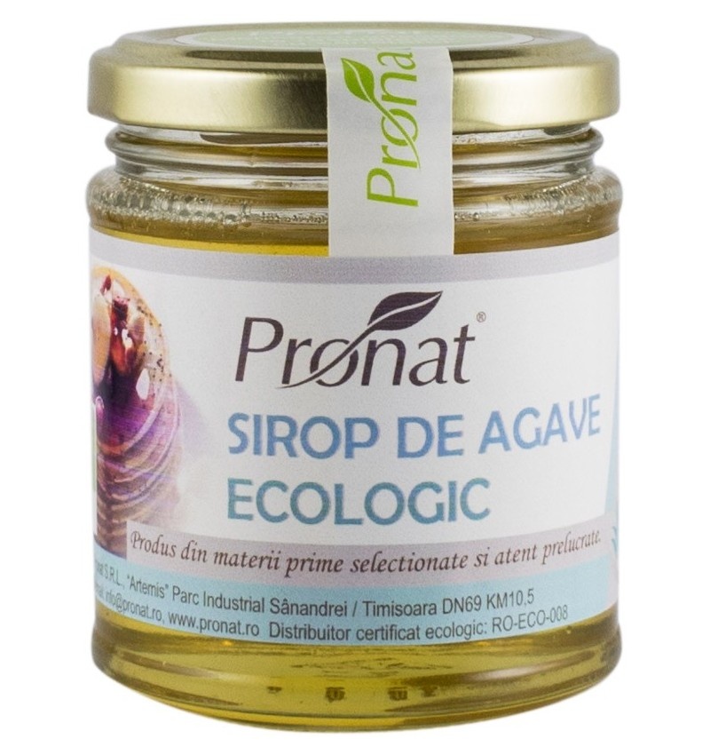 Sirop de agave Bio, 220g, Pronat Siropul de agave, cunoscut și sub denumirea de „Aguamiel” este originar din America de Sud, unde este utilizat pe scară largă pentru preparea diverselor băuturi. Are un conținut ridicat de fructoză, 86-93%, având putere de îndulcire similar zaharozei din zahărul brun din trestie. Produsul este obținut din materii prime selecționate și prelucrate prin tehnologii atent controlate. Siropul de agave poate fi folosit pentru îndulcirea iaurtului, deserturilor, înghețatei, sucurilor sau gemurilor, fiind un substitut ideal pentru zahăr sau miere la prepararea băuturilor sau siropurilor. Fructoza conținută îl recomandă și ca ingredient pentru produse de panificație. Valorile nutriționale sunt supuse variațiilor specifice produselor naturale. Produsul nu este, nu conține și nu este obținut cu organisme modificate genetic, conform normativelor în vigoare. Origine: Mexic Prezentare: 220g