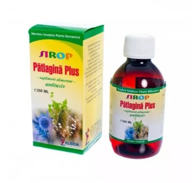 Sirop Patlagina Plus, 200 ml, Elidor Proprietati: Supliment alimentar, adjuvant in tuse. Compoziție: Extract de frunze de pătlagină, extract de scai vânăt, extract de cimbru, benzoat de sodiu, sirop simplu de zahăr. Mod de administrare: Copii peste 3 ani : 1 linguriță de 3 ori pe zi Adulți: 1 lingură de 3 ori pe zi. Prezentare: 200 ml.