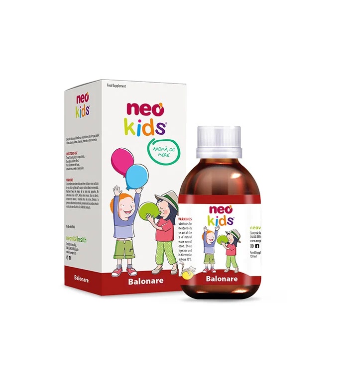 Sirop pentru balonare cu aroma de mere, 150ml, Neo Kids Sirop pe bază de fitoextracte standardizate cu acțiune antispasmodică (anason – Pimpinella anisum, chimion – Carum carvi, fenicul – Foeniculum vulgare, melisă -Melissa officinalis, mușețel – Matricaria recutita) și fosfor. Conține sirop de agave. Nu determină variații bruște ale glicemiei sau apariția cariilor dentare. Mod de administrare: Se administrează 0,5 ml/kg corp. Recomandat de la 6 luni. Doza maximă zilnică: 20ml. Prezentare: 150ml