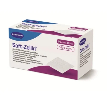 Soft-Zelin Tampoane alcool, 100 bucăți, Hartmann Tampoanele Soft-Zellin sunt produse de unică folosință, realizate din material nețesut, impregnate cu alcool izopropilic 70%, gata pentru utilizare imediată. Datorită texturii moi și flexibile, acestea asigură o aplicare delicată și eficientă pe piele. Sunt recomandate pentru curățarea pielii înainte de proceduri medicale sau cosmetice, contribuind la igienizarea rapidă a zonei de aplicare. Atenționare: Nu este recomandată utilizarea la copiii cu vârsta sub 1 an. Caracteristici principale Material nețesut, moale și rezistent Impregnare cu alcool izopropilic 70% Gata de utilizare, fără pregătire suplimentară Utilizare igienică, de unică folosință Dimensiune practică: 60 x 30 mm Specificații produs Dimensiuni: 60 mm x 30 mm Cantitate: 100 bucăți / cutie
