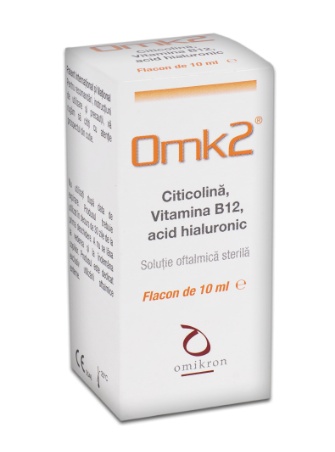 OMK2 solutie oftalmica, 10 ml, Omikron Omk2® este o soluție oftalmică ce conține acid hialuronic cu greutate moleculară mare 0,2%, citicolină 2% și vitamina B12. Datorită prezenței Citicolinei, OMK2® asigură un suport structural util și benefic pentru refacerea integrității membranei celulare lezate de afecțiuni degenerative ale ochiului, cum ar fi retinopatia diabetică incipientă. Indicatii: Omk2®, datorită prezenței Citicolinei și a acțiunii sale asupra structurii celulelor ganglionare retiniene, se poate recomanda pacienților cu retinopatie diabetică incipientă. Datorită prezenței vitaminei B12, stimulează indirect procesul fiziologic de re-epitelizare corneană după intervenții chirurgicale, LASER sau după apariția unor mici leziuni pe suprafața corneei. Omk2® ameliorează senzația de iritație, arsură sau corp străin produsă de factori de mediu sau de utilizarea excesivă a terminalelor video. Administrare: Omk2® se utilizează: 1 picătură de 3 ori/zi, flacon de 10 ml, 30 zile de tratament. Poate fi utilizat până la 30 de zile de la deschidere. Ingrediente: Omk2® conține: citicolină sub formă de sare de sodiu, ciancobalamină (Vitamina B12), acid hialuronic, fosfat de sodiu monobazic monohidrat, fosfat de sodiu dibazic dodecahidrat, clorură de sodiu, clorură de benzalconiu, apă pentru preparate injectabile. Prezentare: 10 ml Prospect: https://oftalmocare.ro/wp-content/themes/twentytwentyone/assets/docs/prospect_OMK%202.pdf