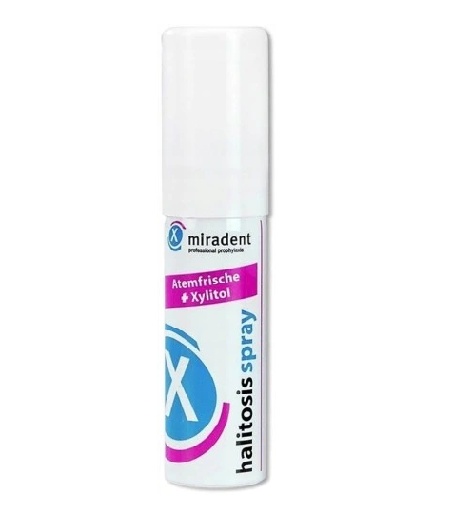 Spray de gura Halitosis cu xylitol, 15ml, Miradent Spray cu xylitol ce distruge bacteriile care produc compusi volatili de sulf si sporeste efectele unei ingrijiri dentare zilnice. Beneficii: contribuie la ingrijirea cavitatii bucale si a membrana mucoasei a acesteia; mecanismul integrat de pompare permite o aplicare simpla si o dozare precisa pe partea din spate a limbii; continutul solutiei este suficient pentru cel putin 150 de aplicari; aroma mentolata proaspata; nu contine alcool sau gaz comprimat. Ingrediente: Contine florura de sodiu (127ppm fluor). Ingrediente active: xilitol. Mod de utilizare: Pulverizati de 1-4 ori in gura de cateva ori pe zi, dupa necesitati.. Rezultatele optime se obtin prin curatarea limbii inainte de a utiliza spray-ul. Atentie! A nu se lasa in lumina directa a soarelui! Nu este potrivit pentru copii mai mici de 6 ani. A nu se pulveriza in ochi. Prezentare: 15ml