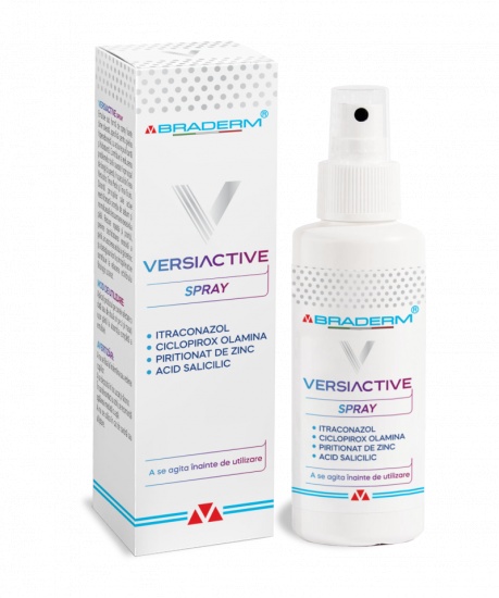 Spray emulsie fluida pentru corp si scalp Versiactive, 100 ml Proprietati: Versiactive spray este o emulsie cutanata care nu necesita clatire, destinata ingrijirii pielii hiperseboreice, cu iritatii si prurit, de la nivelul scalpului si corpului. Contine o asociere unica de ingrediente active cu actiune antifungica, antiinflamatoare si antipruriginoasa, benefica pentru calmarea iritatiei si scuamelor specifice pacientilor cu pitiriasis versicolor, dermatita seboreica, tinea pedis si tinea cruris. Versiactive spray este unicul preparat topic pe baza de Itraconazol, un antimicotic cu spectru larg de generatie mai noua, in combinatie cu alte ingrediente active precum Ciclopirox olamina, Pirocton olamina si Piritionat de zinc. Reechilibreaza secretia de sebum, reduce iritatia, scuamele si pruritul, iar asocierea Acidului Salicilic si Gliciretinic cu Betaglucanii previne deshidratarea excesiva a pielii si contribuie la refacerea echilibrului fiziologic cutanat. Mod de utilizare: dupa curatarea pielii cu un produs specific, se aplica emulsia prin pulverizare pe zonele afectate si se maseaza pana la absorbtia completa a produsului; se recomanda aplicarea zilnica, o data sau de doua ori pe zi, pana la remisia completa a eritemului si scuamelor; pentru rezultate optime se recomanda utilizarea in asociere cu Versiactive gel dermatologic de spalare corp si scalp. Ingrediente: Aqua, Cyclopentasiloxane, Propylene glycol, Polyglyceryl-3 methylglucose distearate, Laureth-9, Cetyl palmitate, Phosphatidylcholine, Piroctone olamine, Salicylic acid, Itraconazole, Ciclopirox olamine, Zinc pyrithione, Glycyrrhetinic acid, Sodium carboxymethyl betaglucan, Dimethyl sulfone, Oenothera biennis oil, Olea europaea oil unsaponifiables, Cetearyl alcohol, Zinc oxide, Cyclohexasiloxane, Imidazolidinyl urea, Disodium EDTA, BHT, Citric acid. Precautii: a nu se lăsa la îndemâna sau vederea copiilor; a se depozita în loc uscat și răcoros; in caz de contact cu ochii, se recomandă spălarea imediată cu apă; a nu se utiliza în caz de sarcină sau alăptare. Prezentare: 100 ml