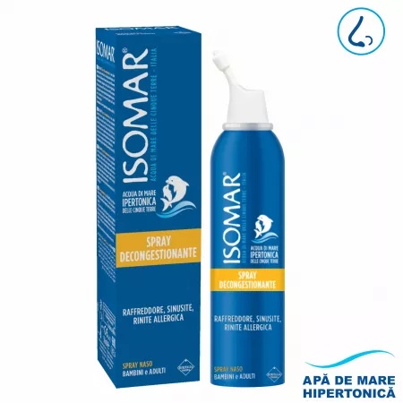Spray nazal decongestionant cu apa de mare hipertonica, 50ml, Isomar ISOMAR® Spray nazal decongestionant este o soluție hipertonică pe bază de apă de mare pură, special conceput pentru o acțiune decongestionantă naturală eficientă la nivelul mucoasei nazale. Apa de mare hipertonică eliberează nasul de excesul de mucus prin osmoză, nu creează dependență, nu deteriorează mucoasa și poate fi folosită și în timpul sarcinii. Beneficii: Destinat copiilor cu vârsta mai mare de 12 luni și adulților în caz de răceli, sinuzite și rinite alergice. Apă de mare hipertonică, de la Cinque Terre, Italia. ISOMAR® Spray nazal decongestionant eliberează nasul de excesul de mucus prin osmoză, nu creează dependență, nu deteriorează mucoasa și poate fi folosit și în timpul sarcinii. Indicatii: ISOMAR® Spray nazal decongestionant este indicat în următoarele cazuri: pentru fluidizarea și îmbunătățirea drenajului mucusului nazal și reducerea edemului la nivelul căilor respiratorii superioare; pentru decongestionarea căilor nazale de mucusul stagnant în caz de răceală și rinită alergică; pentru atenuarea simptomelor la pacienții care suferă de sinuzită și rinosinuzită; pentru curățarea temeinică a cavităților nazale prin îndepărtarea polenului, prafului și a smogului. Mod de utilizare: 2-3 pulverizări în fiecare nară până la maximum 3 ori pe zi. Lăsați soluția să acționeze câteva secunde înainte de a vă sufla nasul. Nu depășiți doza recomandată. Se recomandă a nu se depăși două săptămâni de tratament. În cazul rinitei deosebit de persistente, puteți continua pentru încă 2 săptămâni cu ISOMAR® Spray nazal și auricular pentru igiena zilnică. Dacă problema persistă, adresați-vă medicului dumneavoastră sau unui specialist. Nu folosiți la copiii sub un an. După utilizarea ISOMAR® Spray nazal decongestionant îndepărtați duza, clătiți-o cu apă și lăsați-o să se usuce. ISOMAR® Spray nazal decongestionant poate fi utilizat atât în poziție verticală, cât și orientat în jos, pentru a face spălarea nazală pentru adulți și copii mai eficientă și mai simplă. In pozitia verticala: utilizarea spray-ului pe verticală permite un acces mai bun la toate cavitățile septului nazal, favorizând astfel o curățare mai temeinică și mai rapidă. Orientat in jos: pentru a aplica produsul copiilor de peste 12 luni aflați în poziție culcată. Dispozitiv medical Ingrediente: Apă de mare hipertonică (concentrația naturală de sare din apa de mare este de aproximativ 3%), Gaz propulsor: azot. Nu conține conservanți și coloranți. Prezentare: 50ml