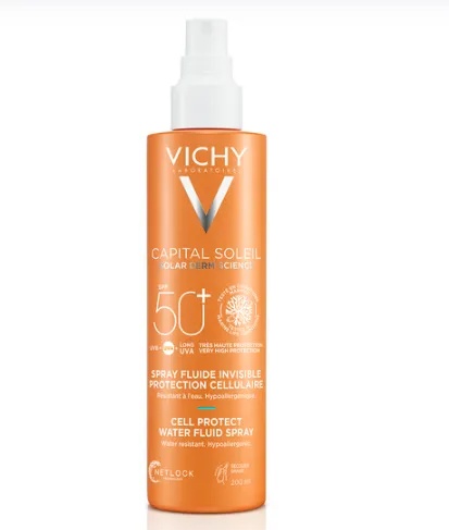 Spray protector Capital Soleil SPF50+, 200ml, Vichy Proprietati : spray protector in 4 moduri: UVB + UVA + UVA Lungi + Antioxidant – protecție la nivel celular; filtrele folosite sunt non-toxice cu mediul; Tehnologia Netlock – film ultra-subtire ce asigura o întindere uniformă a produsului, invizibilă și rezistență la apă, nisip și transpirație; formulat cu acid hialuronic, fracții probiotice și apă vulcanică Vichy; textura ultra ușoară, fluidă, pe bază de apă; invizibil pe toate tipurile de piele; hipoalergenic, testat pe piele sensibilă. Mod de utilizare: Pulverizați pe piele înainte de expunerea la soare. Reaplicați frecvent, la fiecare 2 ore. Prezentare: 200ml